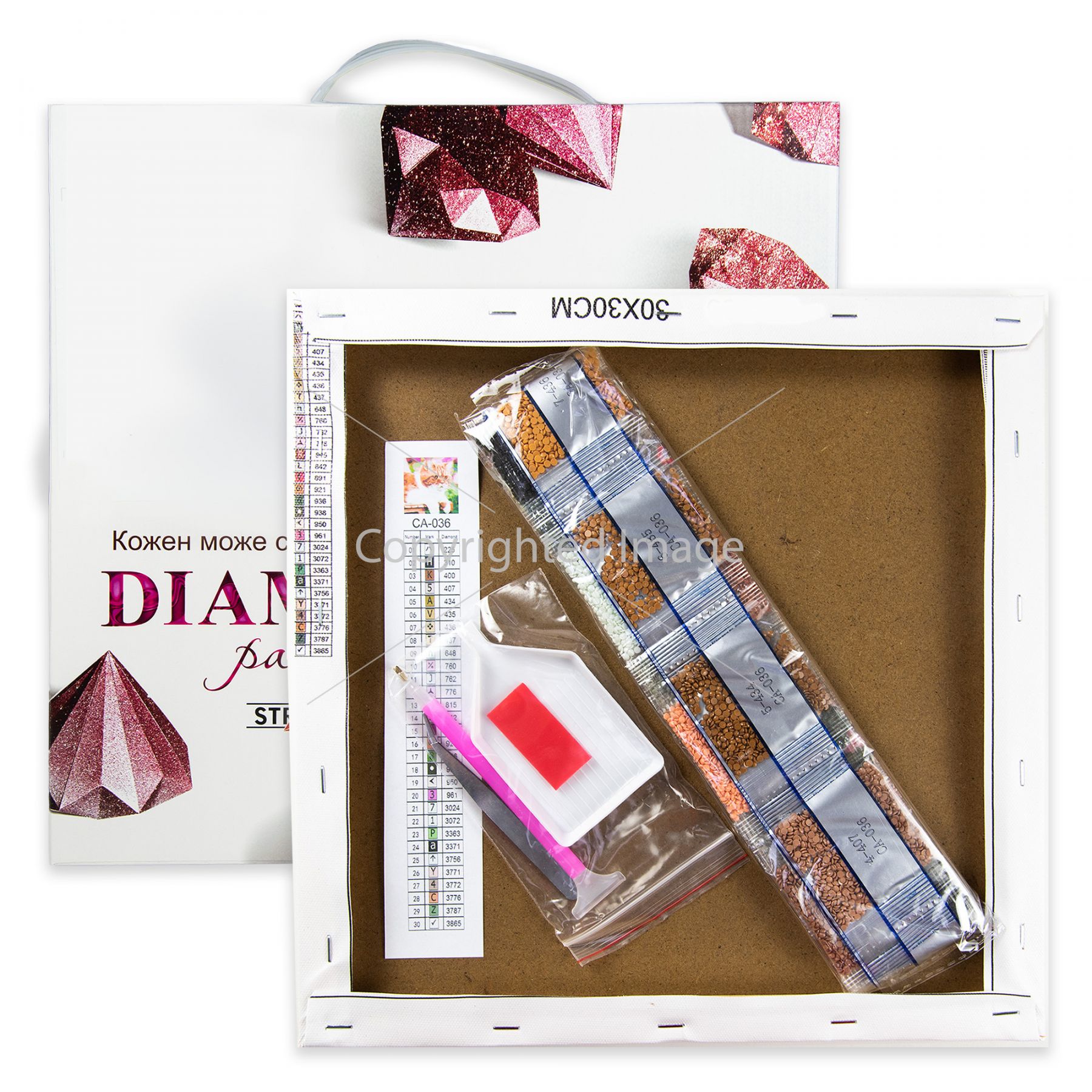Комплектація:Полотно із клейовим шаром; дерев'яний підрамник; акрилові квадратні стрази згідно з комплектацією набору; пінцет для страз; спеціальна ручка-стилус для роботи зі стразами; гель-клей; лоток для сортування страз.