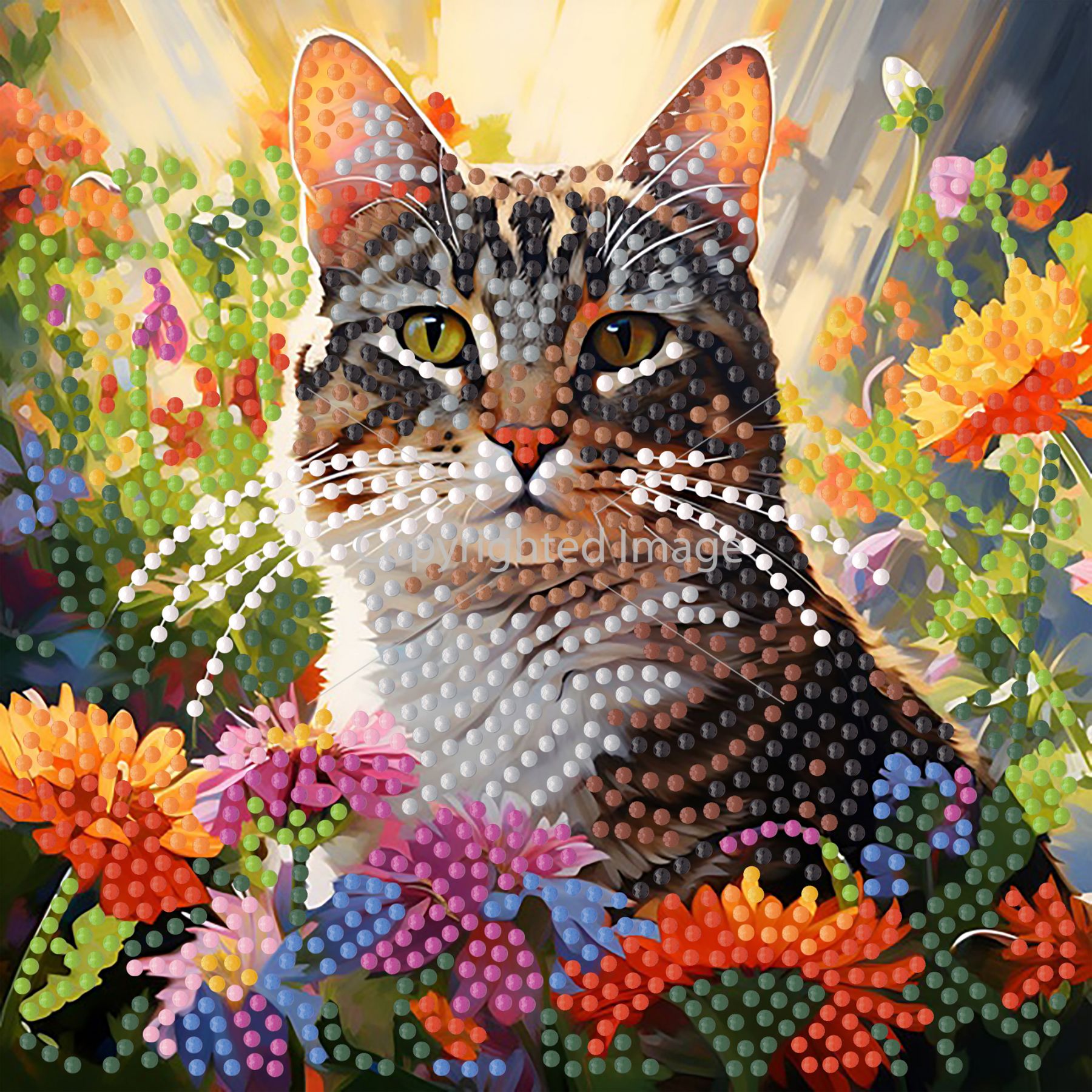 Алмазна мозаїка Strateg ПРЕМІУМ Кіт серед квітів на паперовій основі розміром 18х18 см (ZAV1818-12)
