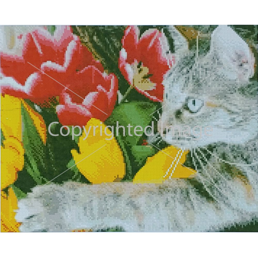 Алмазна мозаїка Strateg ПРЕМІУМ Котик з тюльпанами розміром 40х50 см (D0053) - складність 3, кількість кольорів - 28.