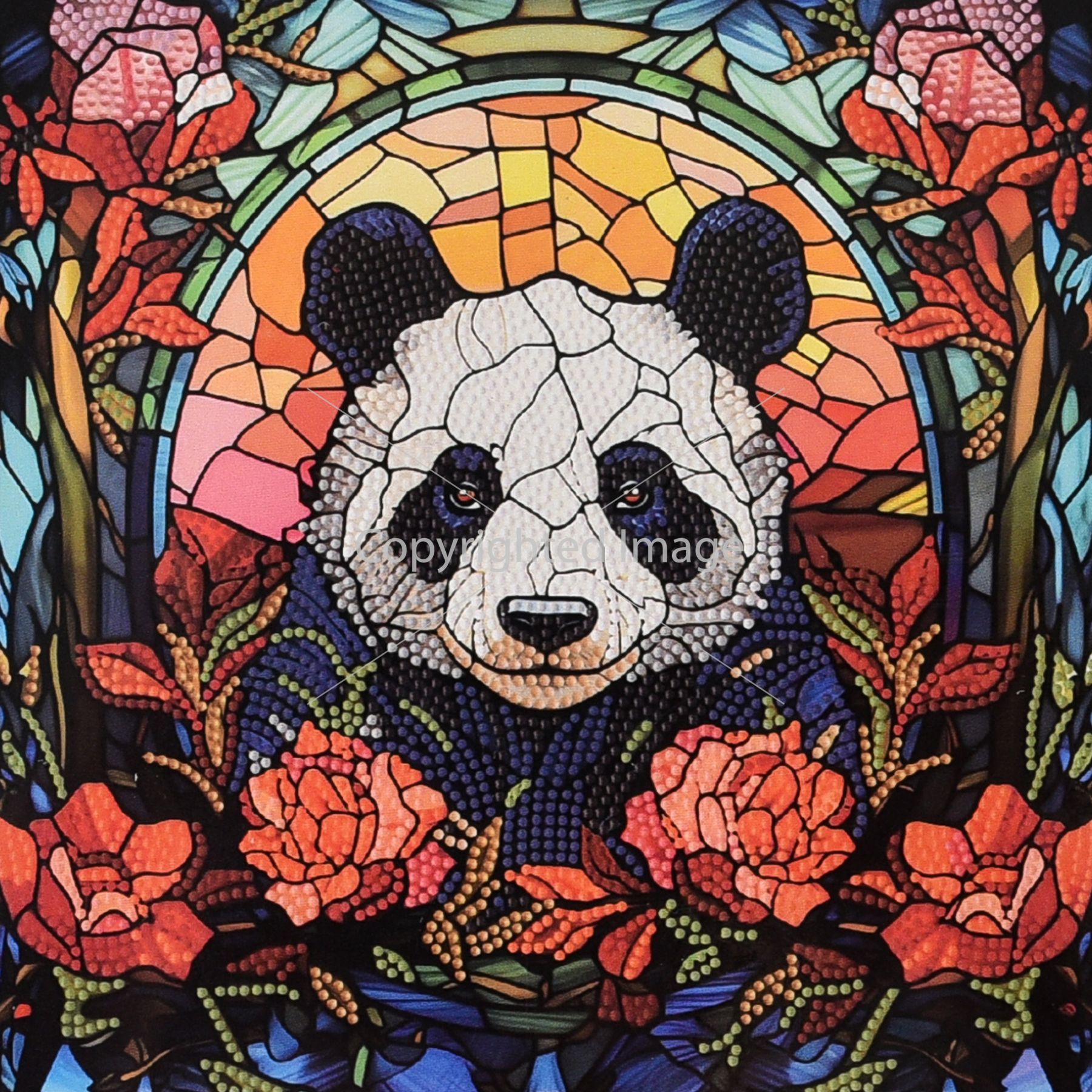 Алмазна мозаїка Strateg ПРЕМІУМ Панда серед троянд розміром 30х30 не повна викладка (DEEX16305)