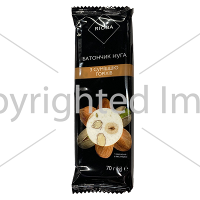 Батончик нуга Rioba з сумішшю горіхів. Продукт готовий до вживання.