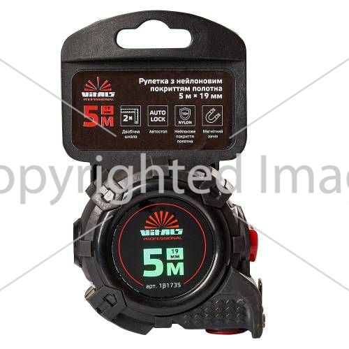 Опис будівельної рулетки гумової з нейлоновим покриттям полотна 5 м × 19 мм автостоп Vitals Professional