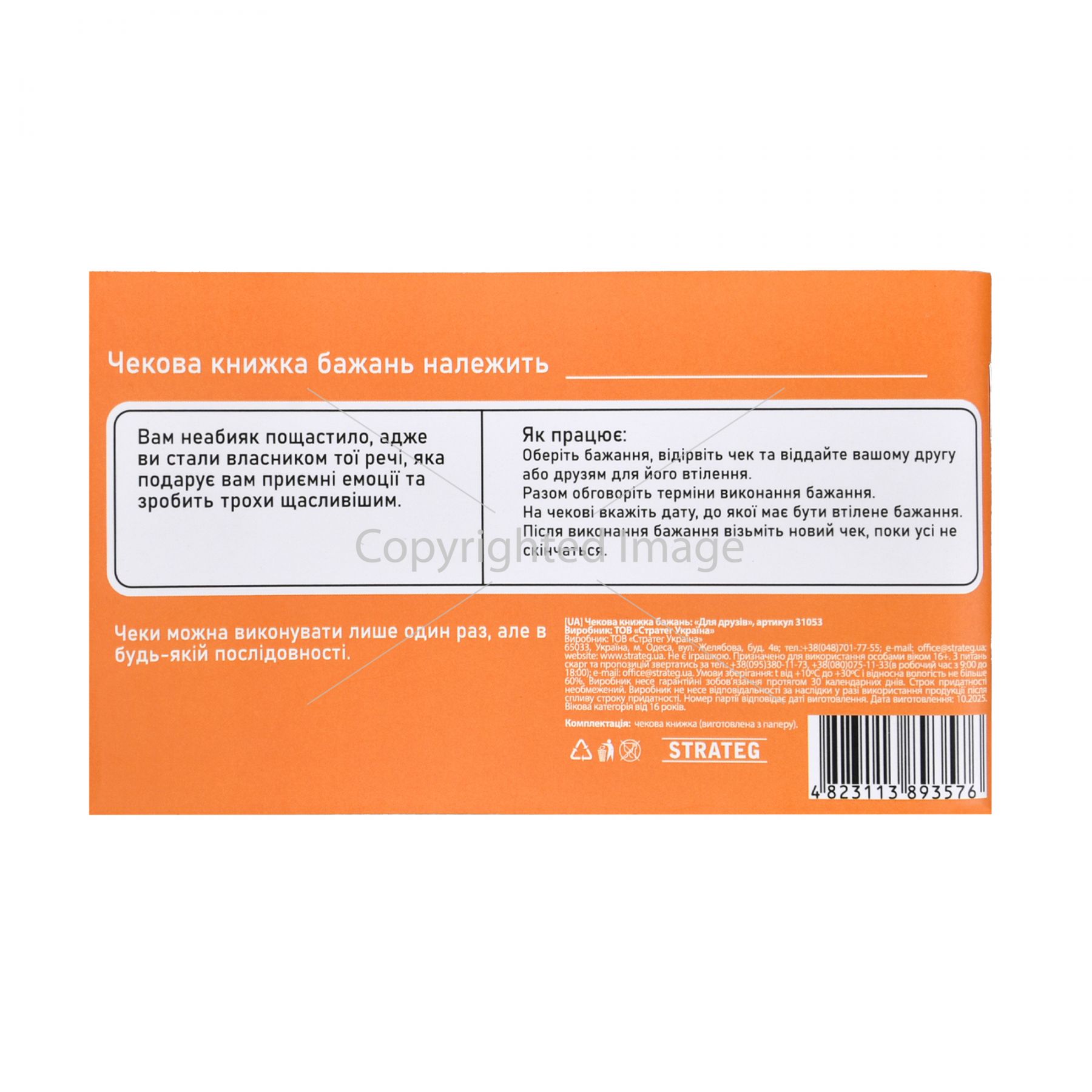 Чекова книжка бажань «Для друзів» — це веселий набір завдань, створений для тих, хто хоче додати більше емоцій і різноманіття до зустрічей із друзями. У книжці — 32 чеки, кожен з яких можна відірвати та виконати у зручний момент, записавши дату здійснення. Формат книжки дає змогу легко обирати активності залежно від настрою: від дружніх викликів до милих жестів підтримки.Обирайте, відривайте та даруйте одне одному незабутні моменти!Вік: 16+Розмір коробки: 15,5 х 9 х 0,5 смВага: 70 гКомплектація: чекова книжка