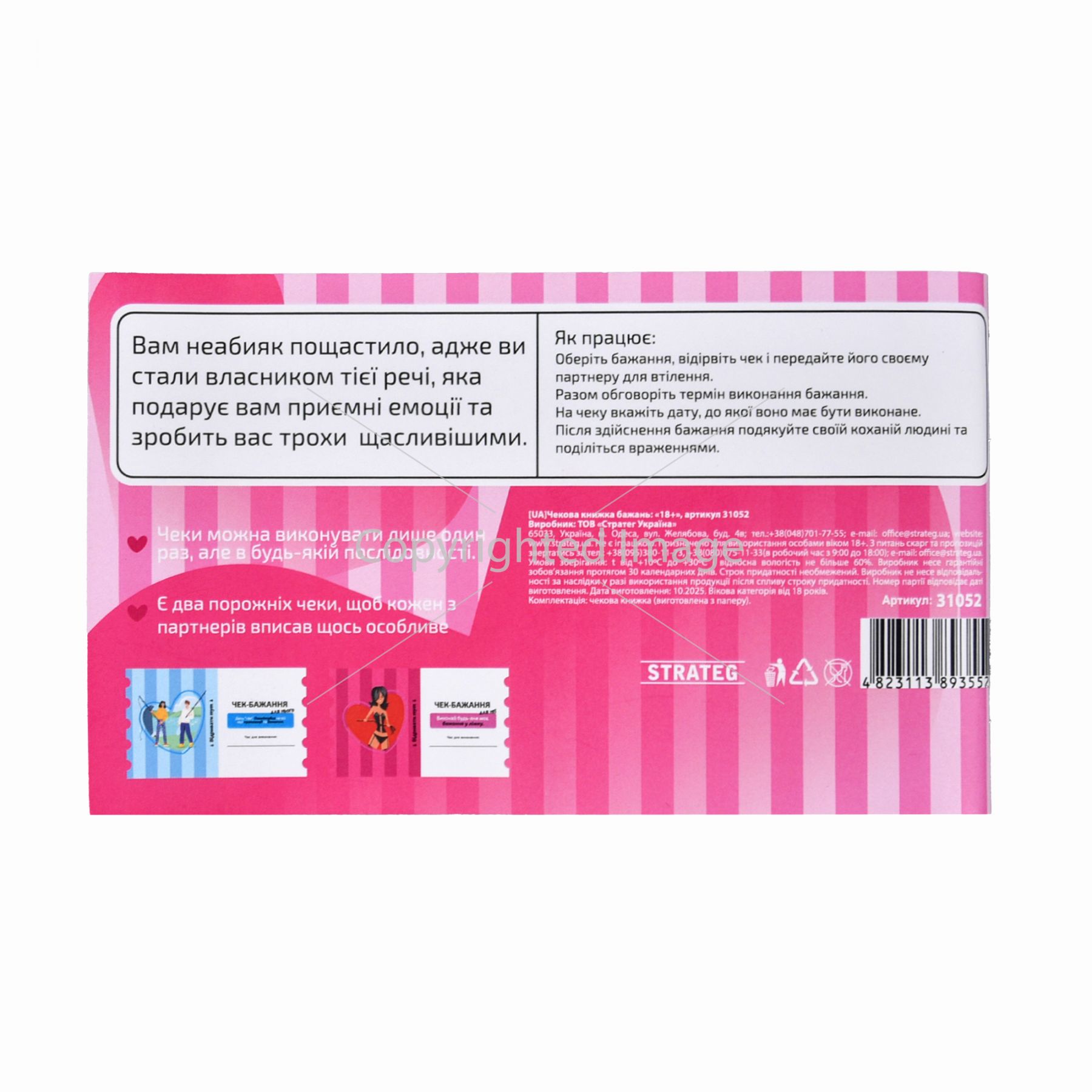 Чекова книжка бажань «Для пар» — це романтичний набір завдань для тих, хто хоче додати більше тепла й уваги до стосунків. У книжці — 30 готових чеків і два порожні для власних бажань. Завдання поділено на категорії «для нього» та «для неї», тож легко обрати те, що зробить день приємнішим. Усередині —збірка милих, турботливих активностей і легких романтичних моментів.Обирайте, відривайте та даруйте одне одному теплі моменти!Вік: 18+Розмір коробки: 15,5 х 9 х 0,5 смВага: 70 гКомплектація: чекова книжка