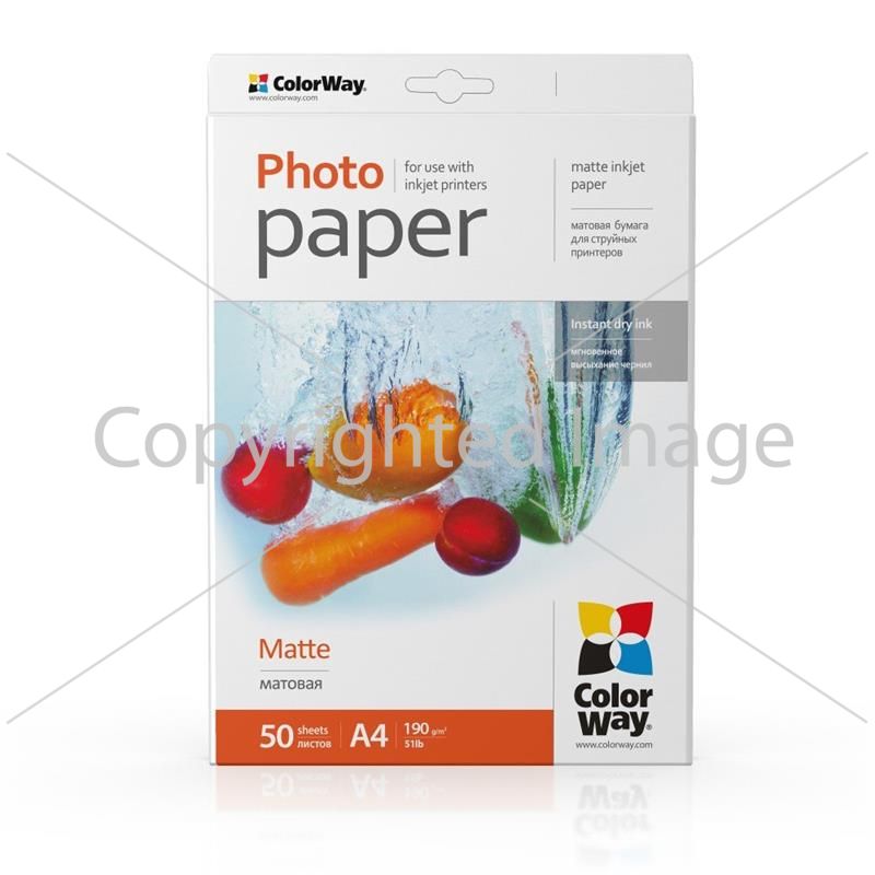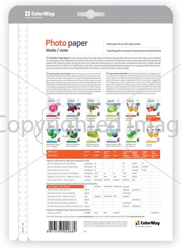 Матовий папір ColorWay для струменевого друку. Має високу ступінь білизни і матову рівну поверхню, забезпечує високий контраст, відсутність відблисків, відбитків пальців на нанесеному зображенні. Володіє широкою кольоровою гамою і хорошим усмоктуванням чорнил. Підходить для водорозчинних та пігментних чорнил. Чим менше у паперу показник щільності, тим менше повинна бути заливка листа. Зберігати в сухому місці в стороні від сонячного світла. Температура зберігання від 5°С до 25°С. Не містить шкідливих для здоров"я речовин. Надруковані знімки рекомендовано зберігати в альбомах або в рамках під склом. Ця модель паперу призначена тільки для друку на струменевому принтері та персонального використання.