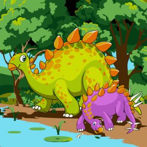 Картина за номерами Strateg ПРЕМІУМ Динозаври біля берега з лаком та з рівнем розміром 30х30 см (ES-0833)