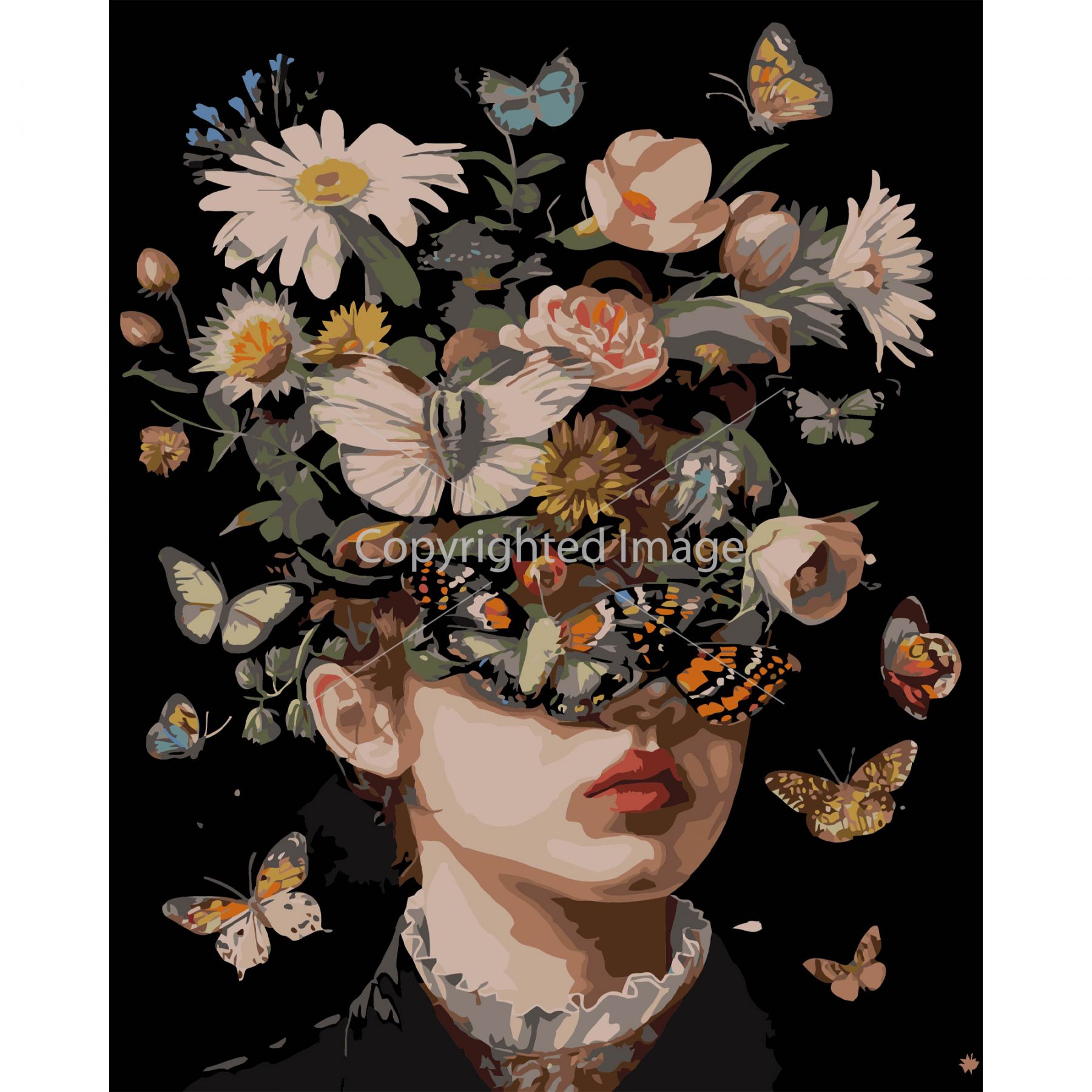 Картина за номерами Strateg ПРЕМІУМ Дівчина і метелики на чорному фоні розміром 40х50 см (AH1176-19