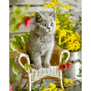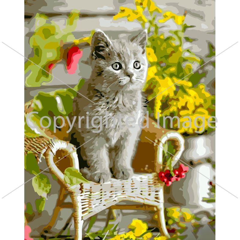 Картина за номерами Strateg ПРЕМІУМ Котик в кріслі з лаком та з рівнем розміром 40х50 см (GS1381)