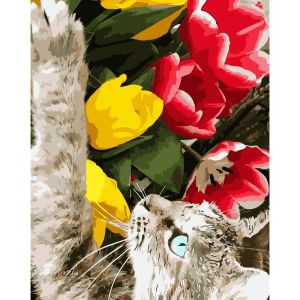 Картина за номерами Strateg ПРЕМІУМ Котик з тюльпанами з лаком розміром 40х50 см (SY6810)