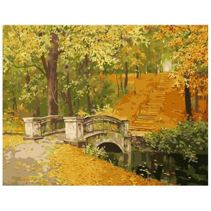 Картина за номерами Strateg ПРЕМІУМ Міст в осінь з лаком розміром 40х50 см VA-0277