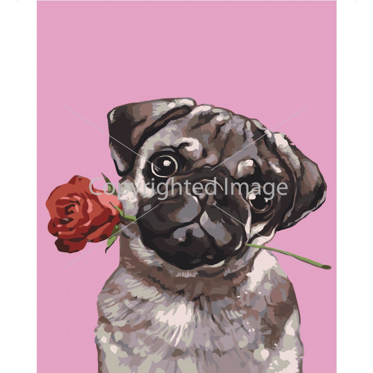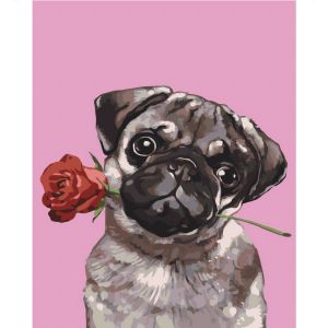 Картина за номерами Strateg ПРЕМІУМ Мопс із розою з лаком розміром 30х40 см SS-6403