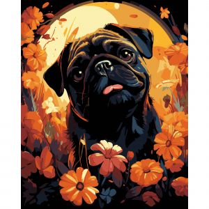Картина за номерами Strateg ПРЕМІУМ Мопс у квітах на чорному фоні розміром 40х50 см (AH1228-18)
