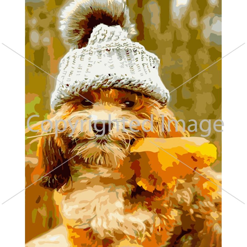 Картина за номерами Strateg ПРЕМІУМ Пес в пухнастій шапці з лаком та з рівнем розміром 40х50 см (GS1350)