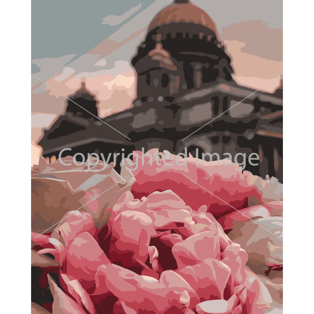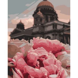 Картина за номерами Strateg ПРЕМІУМ Півонії на фоні собору розміром 40х50 см (GS436)
