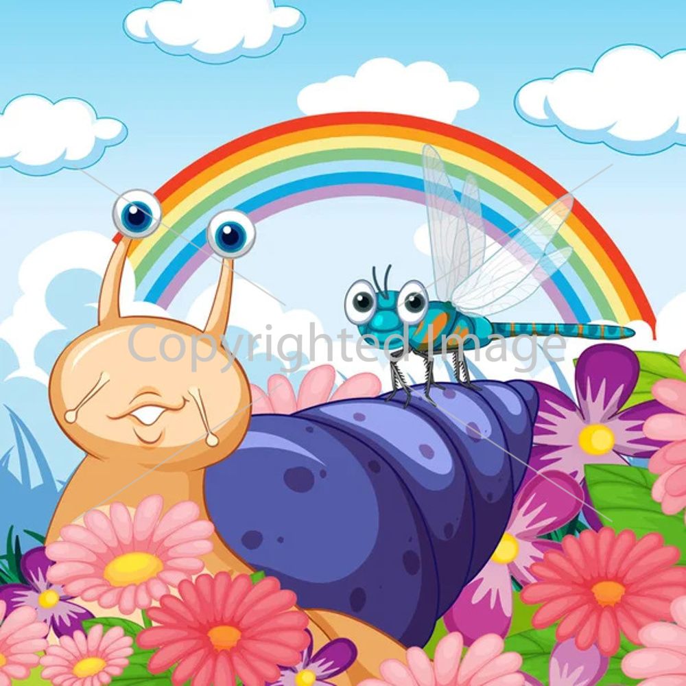 Картина за номерами Strateg ПРЕМІУМ Равлик та бабка під веселкою з лаком та з рівнем розміром 30х30 см (ES214)