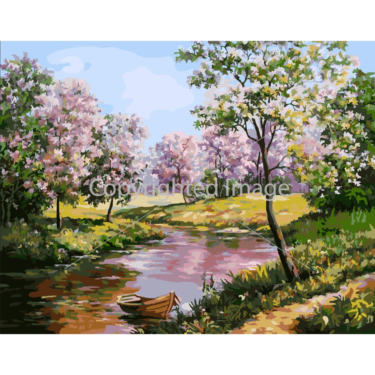 Картина за номерами Strateg ПРЕМІУМ Річка серед квітучих дерев з лаком розміром 40х50 см SY6610