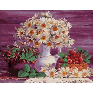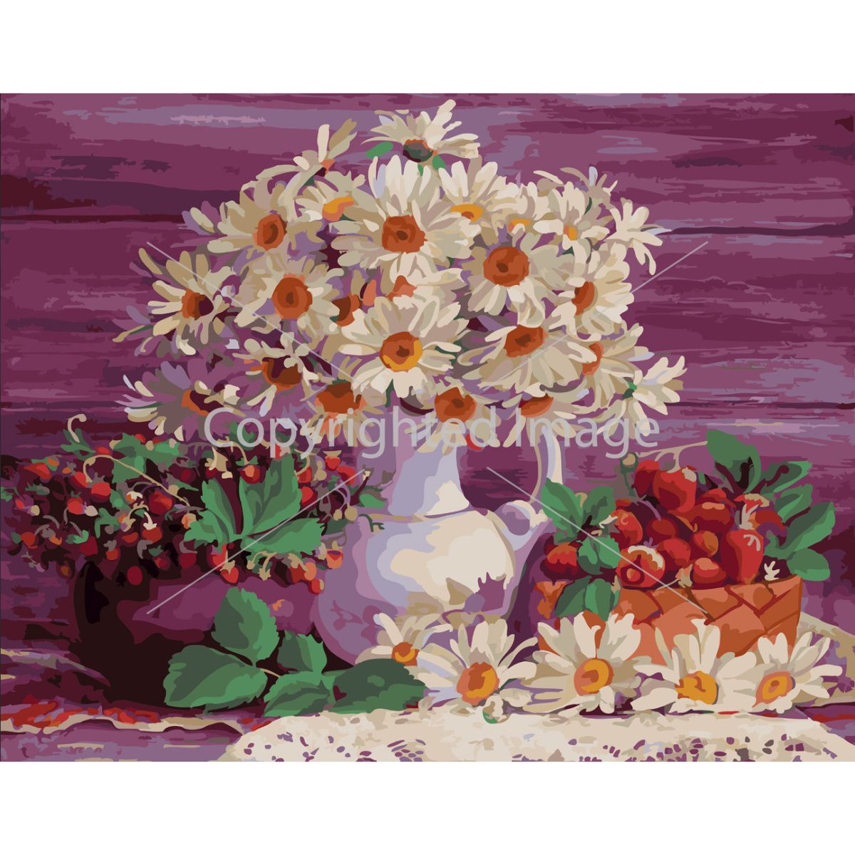 Картина за номерами Strateg ПРЕМІУМ Ромашки та суниці з лаком розміром 40х50 см SY6598