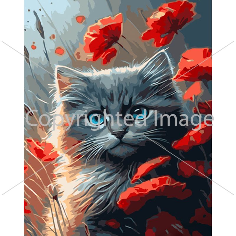 Картина за номерами Strateg ПРЕМІУМ Сірий котик у маках з лаком та з рівнем розміром 40х50 см (GS1485)