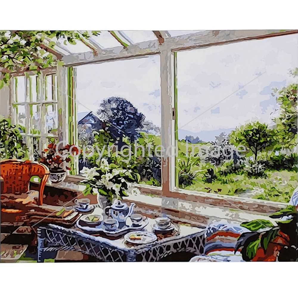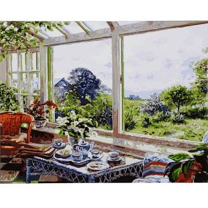 Картина за номерами Strateg ПРЕМІУМ Сніданок на веранді з лаком розміром 40х50 см (SY6606)