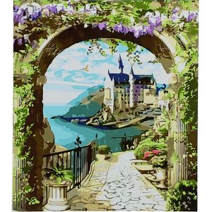 Картина за номерами Strateg ПРЕМІУМ Замок через арку з лаком розміром 30х40 см (SS-6548)