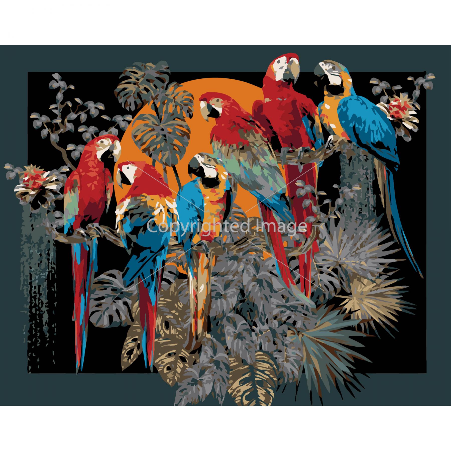 Картина за номерами Strateg ПРЕМІУМ Зграя папуг на чорному фоні розміром 40х50 см (AH1230-19)
