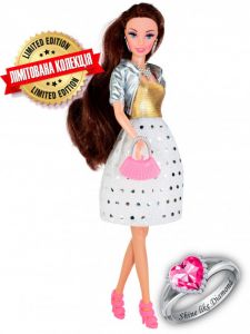 Комплектація:Лялька, 2 сукні, болеро, взуття, сумочка, кольє, сережки для ляльки, кільце для дитини