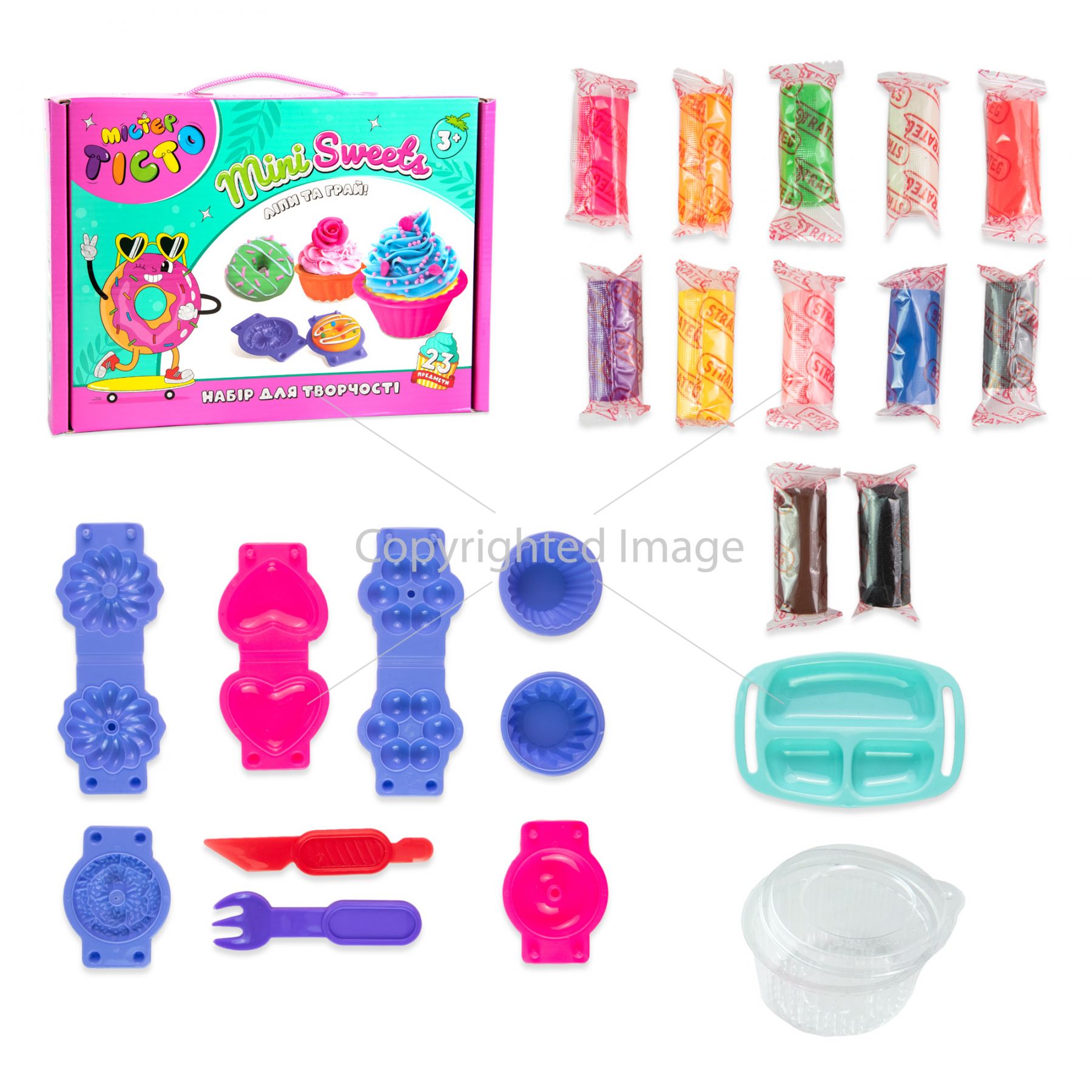 ♦ Комплектація: коробка, маса для ліплення – 12 шт., упаковка для виробів з тіста – 1 шт., елементи набору – 10 шт.