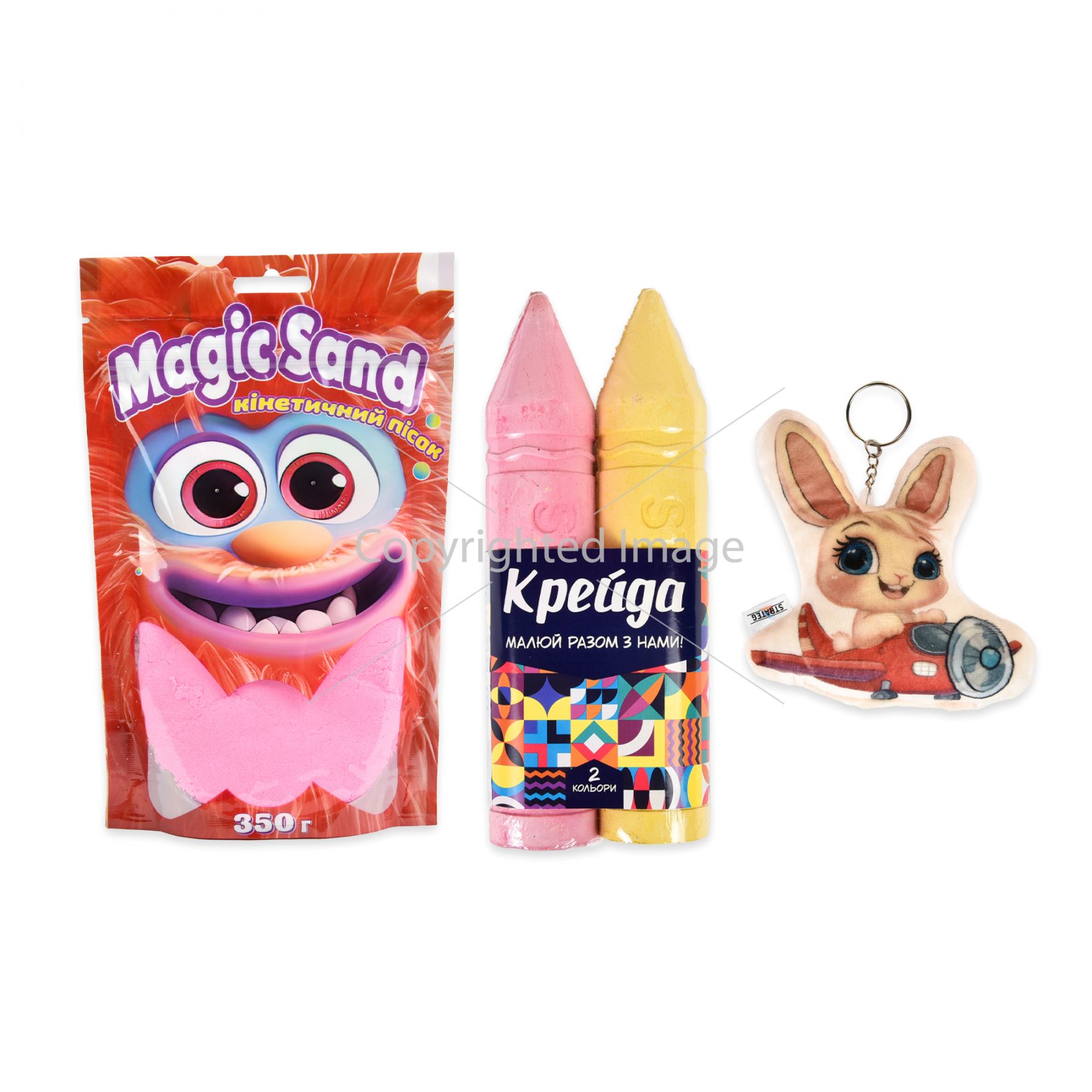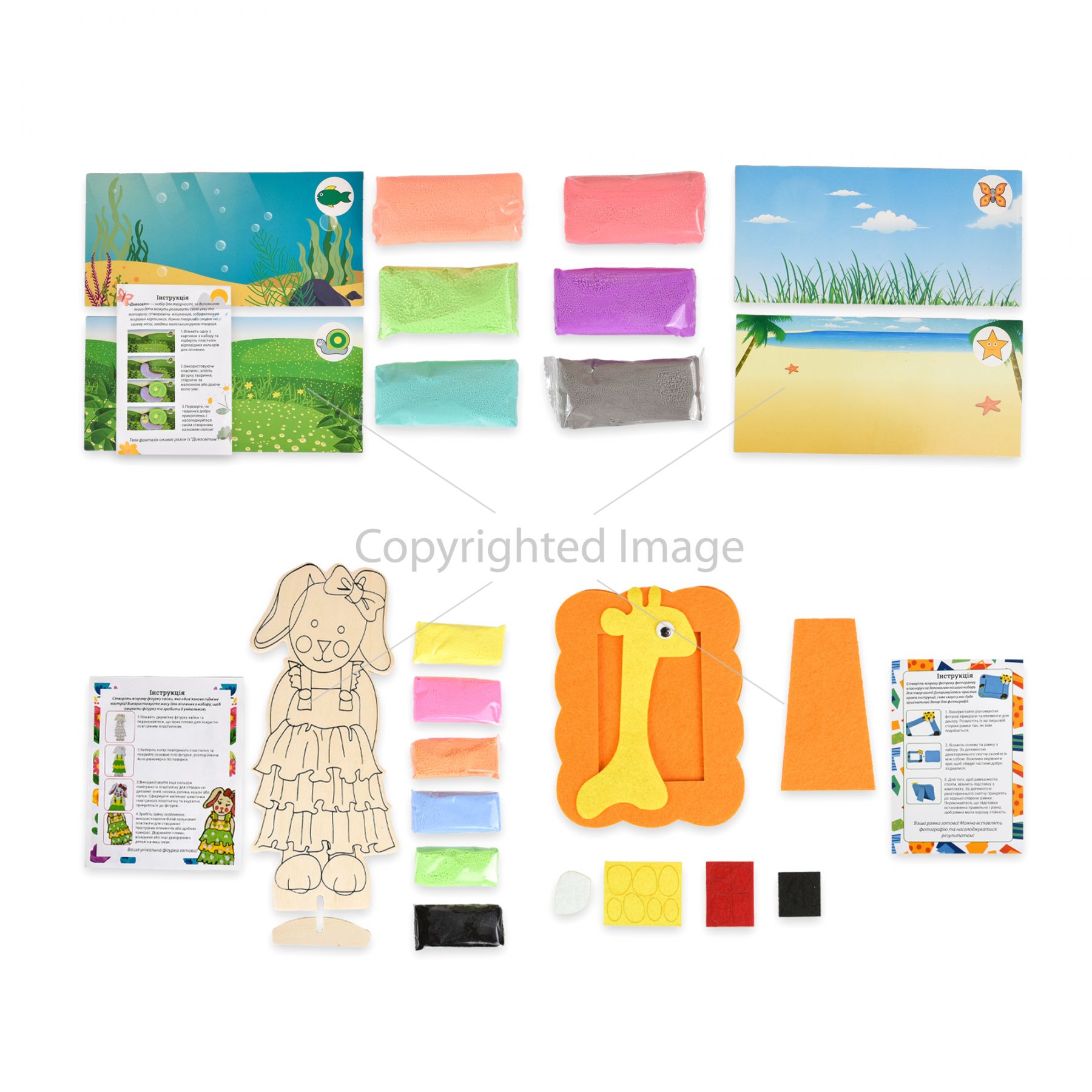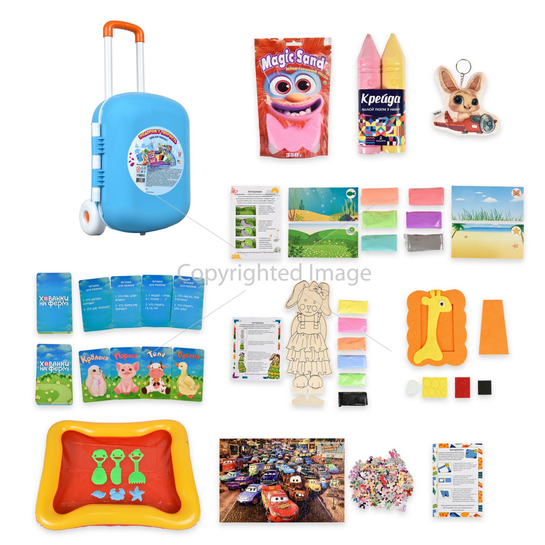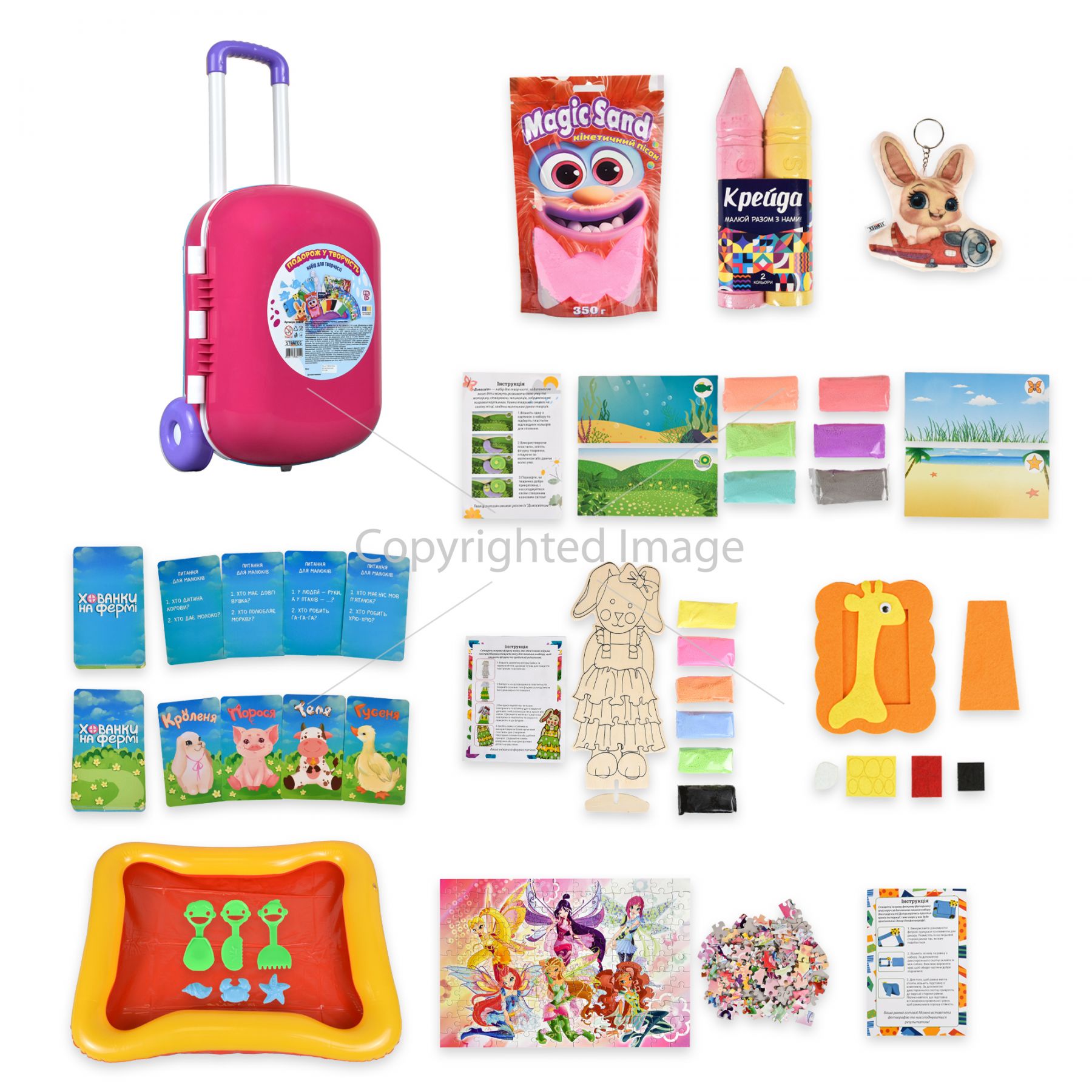 Комплектація:упаковка, набір для творчості "Дивосвіт", настільна гра "Хованки на фермі", набір для творчості "Дерев'яна тваринка", крейда "Олівець 2 шт.", набір для творчості "Фетрова фоторамка", палітурні пазли, кінетичний пісок "Magic sand" 350 г, набір для кінетичного піску, брелок