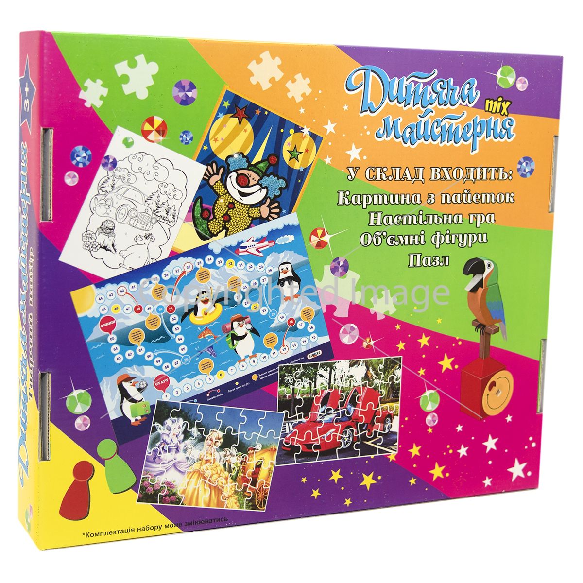 Комплектація:Настільна гра, пазл, картина з гліттера та паєток, об'ємна фігура