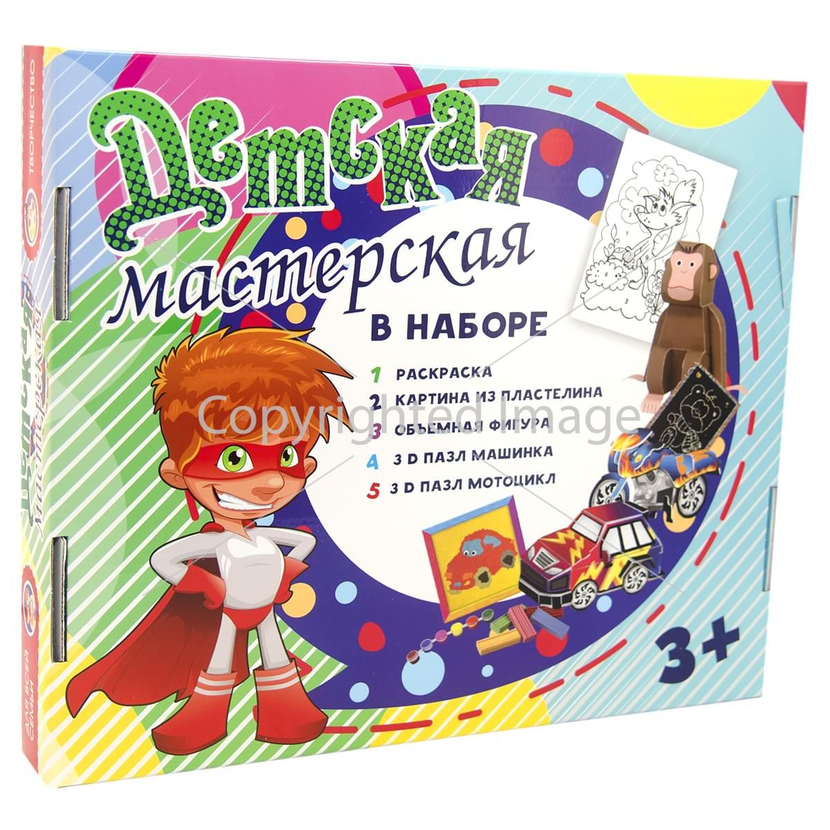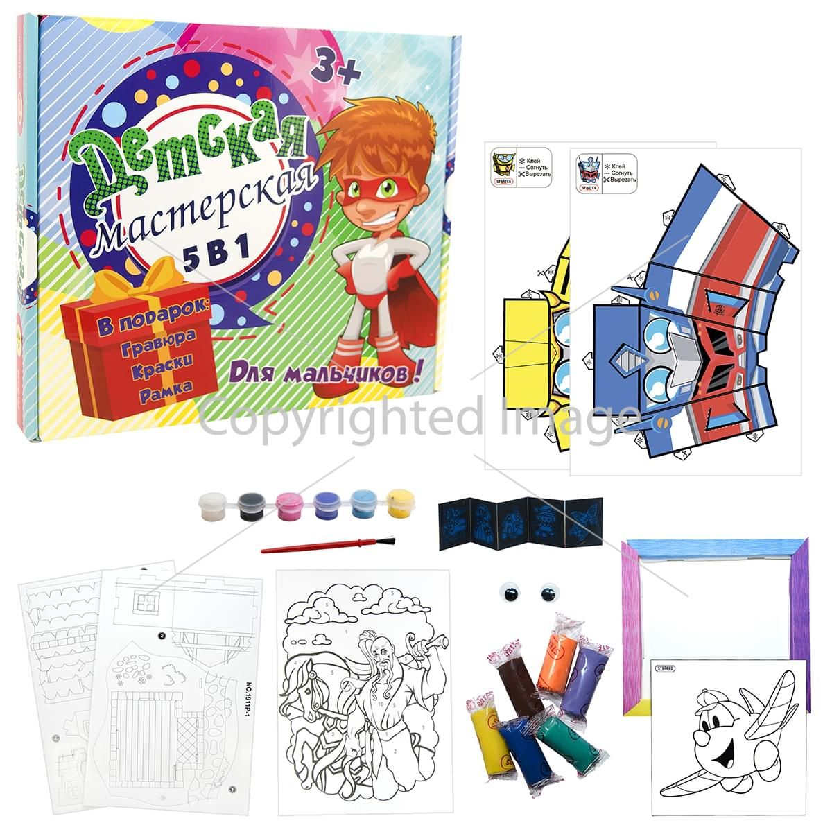 Поєднати розваги з творчістю, розвинути фантазію і художні здібності хлопчика допоможе набір «Дитяча майстерня для хлопчиків 5 в 1». Підійде для маленького художника, скульптора початківця, любителя конструювати і своїми руками виготовляти оригінальні подарунки і креативні прикраси. Основна умова - необхідна фантазія маленького майстра, а все інше є в наборі - розмальовка, гравюра, об'ємна фігура, картина з пластиліну, 3D пазл-конструктор.