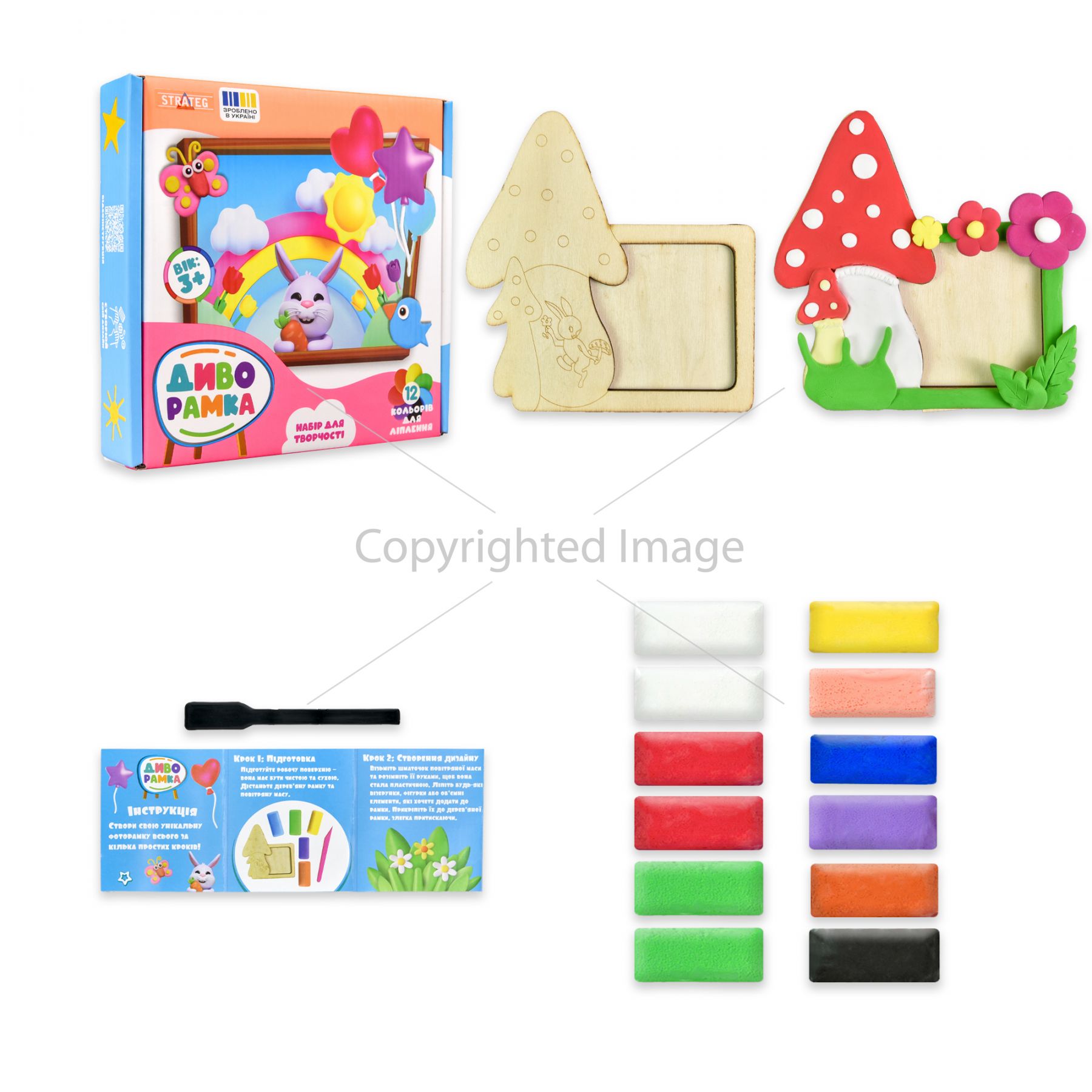 Комплектація: коробка (виготовлена з картону), маса для ліплення - 12 шт., стек (виготовлений з пластику), рамка (виготовлена з фанери), інструкція (виготовлена з паперу).