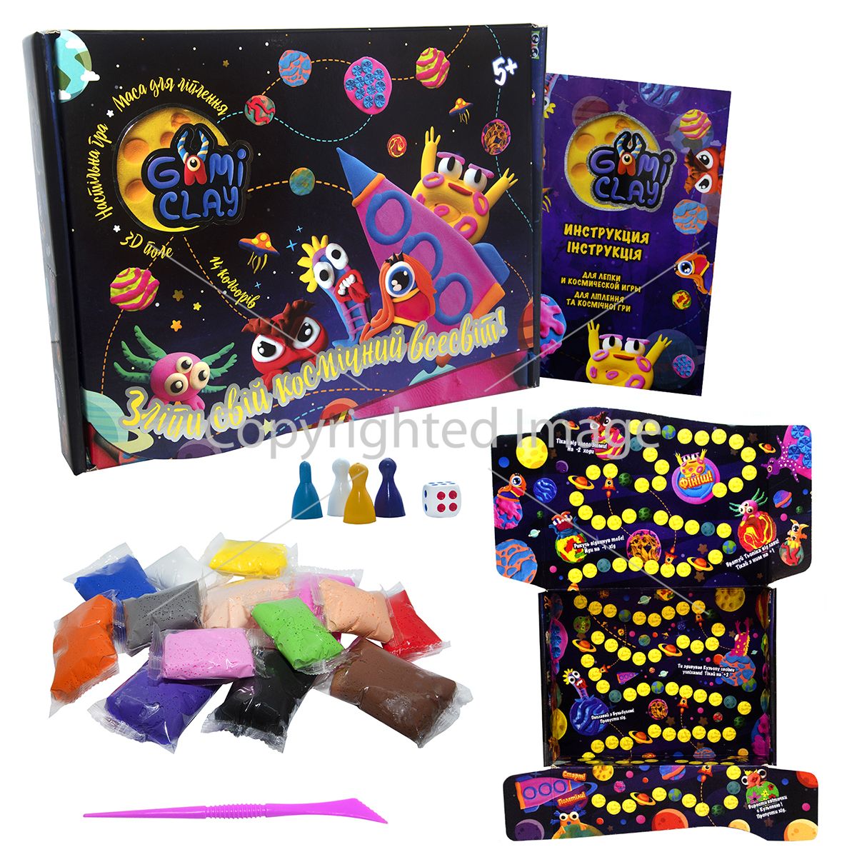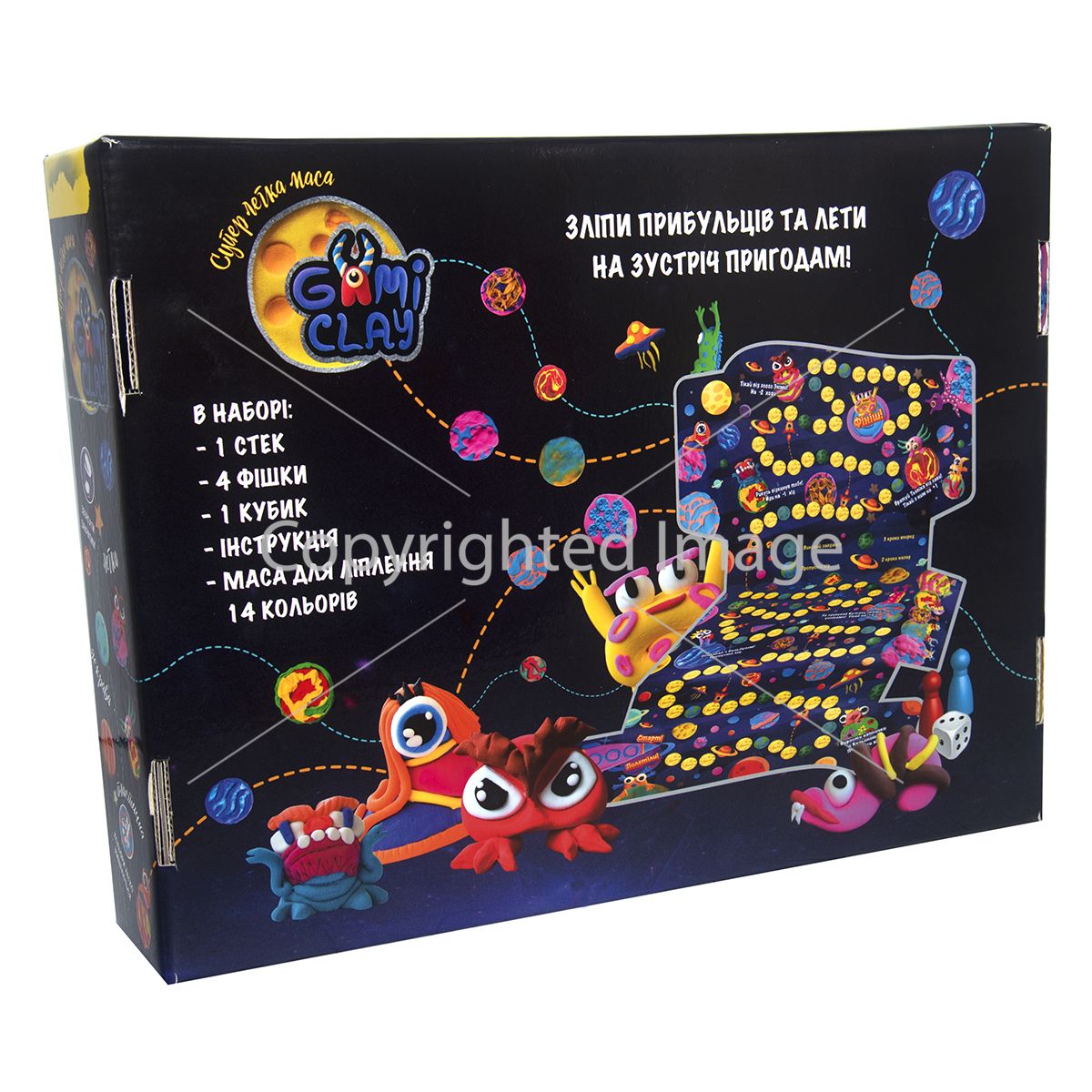 Маса для ліплення «Gumi clay» - це гарна можливість своїми руками створити фігурку улюбленого персонажа, розвинути творчі здібності малюка, моторику пальчиків та уяву. На допомогу маленькому творцю у наборі є барвиста космічна інструкція та спеціальний інструмент. Після того як іграшка готова, маса застигає протягом 30 хвилин, перетворюючись на легкий, але міцний виріб яскравих кольорів. Маса для ліплення дуже пластична, різні кольори легко змішуються, вона не забруднює руки і може набувати будь-якої форми. З готовими фігурками можна розіграти масу захоплюючих пригод на тривимірному ігровому полі, для гри в комплекті передбачено кубик та фішки – за допомогою фантазії вперед до перемоги у космічних битвах! ♦ Вік: 5+ ♦ Розмір упаковки: 30 х 23 х 6.8 см. ♦ Комплектація: маса для ліплення Gumi clay 14 упаковок по 10 гр., фішки, кубик, стек, коробка-поле, інструкція. ♦ Склад маси: вода, наповнювач, барвник. Мова українська.