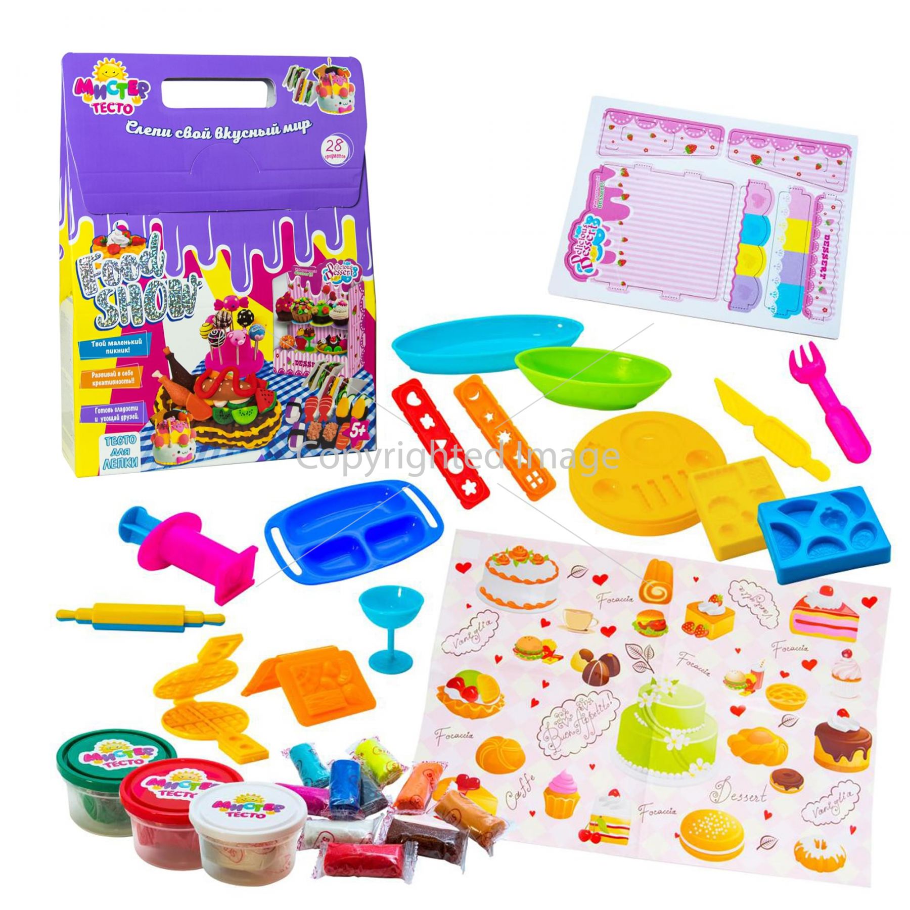 Ваш малюк любить пригощати друзів і готувати їжу? Допоможіть створити йому власну кухню за допомогою набору «Містер тісто - Food show». Велику кількість різних видів смачних ласощів допоможуть відтворити формочки, кухонне приладдя, кондитерський шприц і тарілочки для сервірування. Можна сфантазувати будь-який вид смачного частування і виліпити його зі спеціального тіста. Тісто дуже пластичне, різні кольори легко змішуються, воно не забруднює руки і може приймати будь-яку форму. Має яскраві кольори і абсолютно безпечне. Додатковий ефект стравам додадуть стіки з блискітками! Готові страви можна розмістити на спеціальній вітрині. У комплекті є барвиста інструкція із зразками готових ласощів.