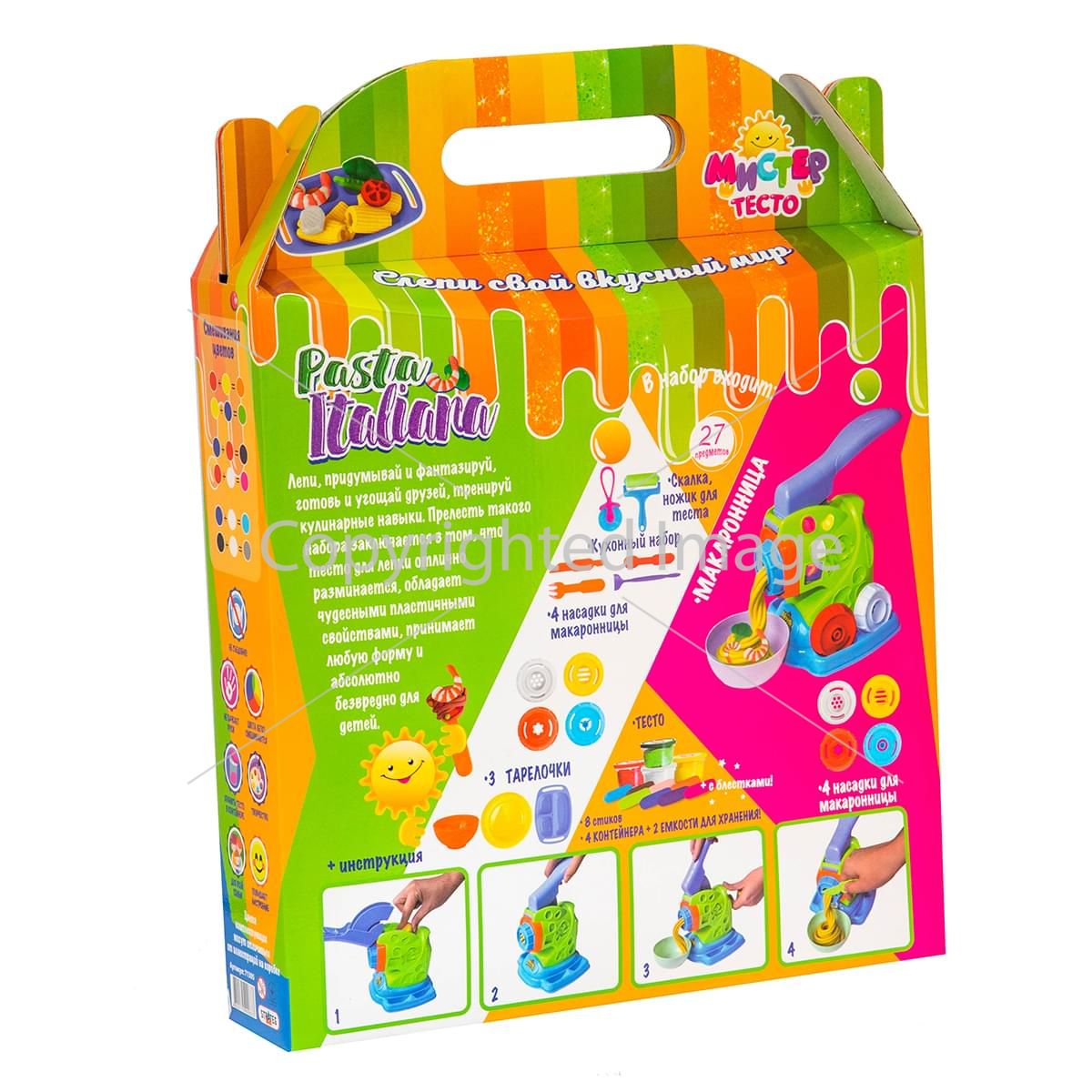 Ніжні равіолі, вишукана паста і смачні італійські вироби з тіста - хто з нас не любить італійську кухню? Великий набір «Містер Тісто Паста Італія» подарує дитині можливість відчути себе справжнім шеф - майстром, який створює чарівні страви на своїй кухні! Це італійський ресторанчик в мініатюрі - в наборі є скалка, ніж для тіста, 4 формочки і 4 насадки для макаронниці! А матеріалом, з якого дитина приготує свою першу пасту, стане м'яке і пластичне тісто. Воно відмінно ліпиться, не липне до ручок і не забруднює їх. Тісто з блискітками приймає будь-яку форму, дозволить малюкові проявити найсміливіші фантазії! Це справжній італійській бенкет!