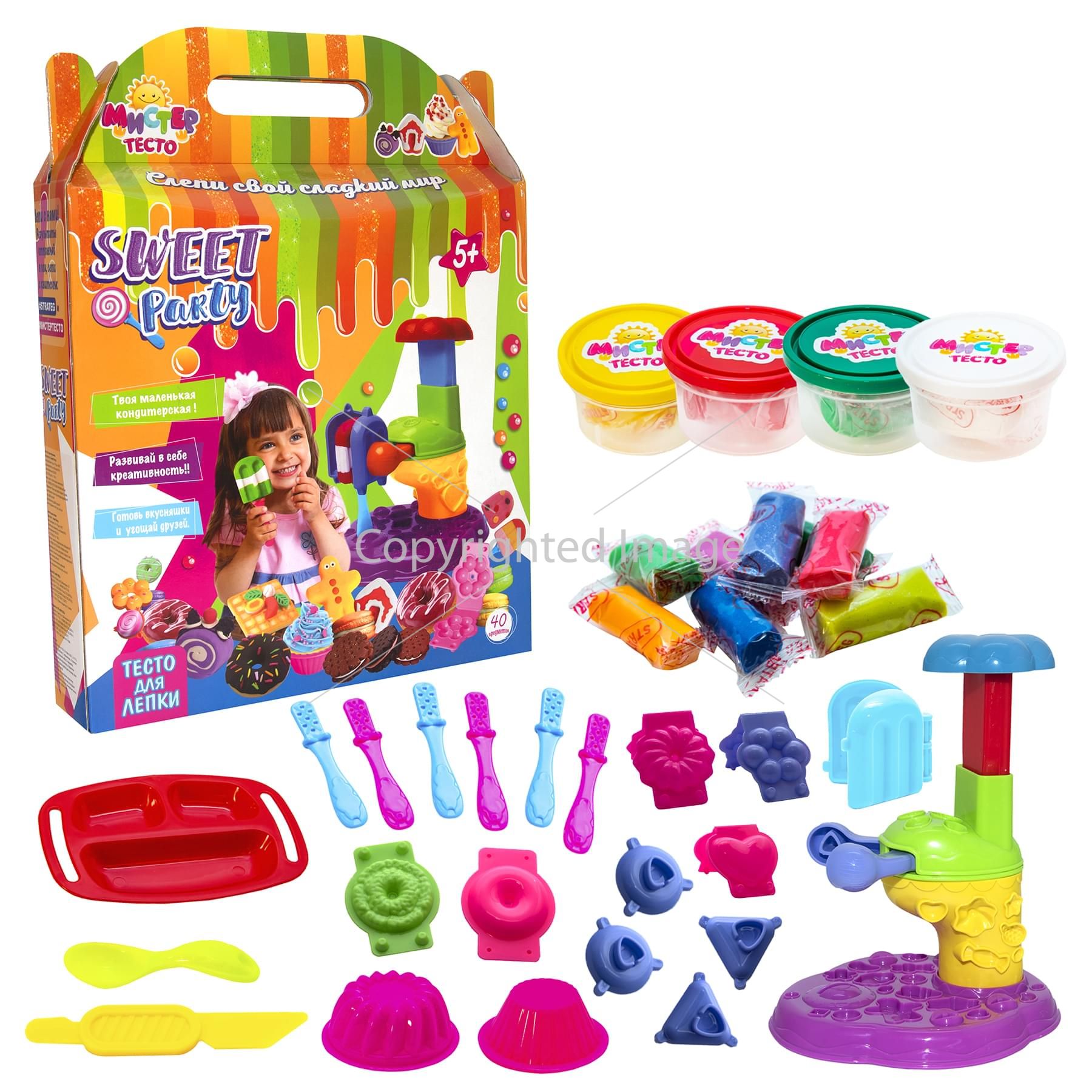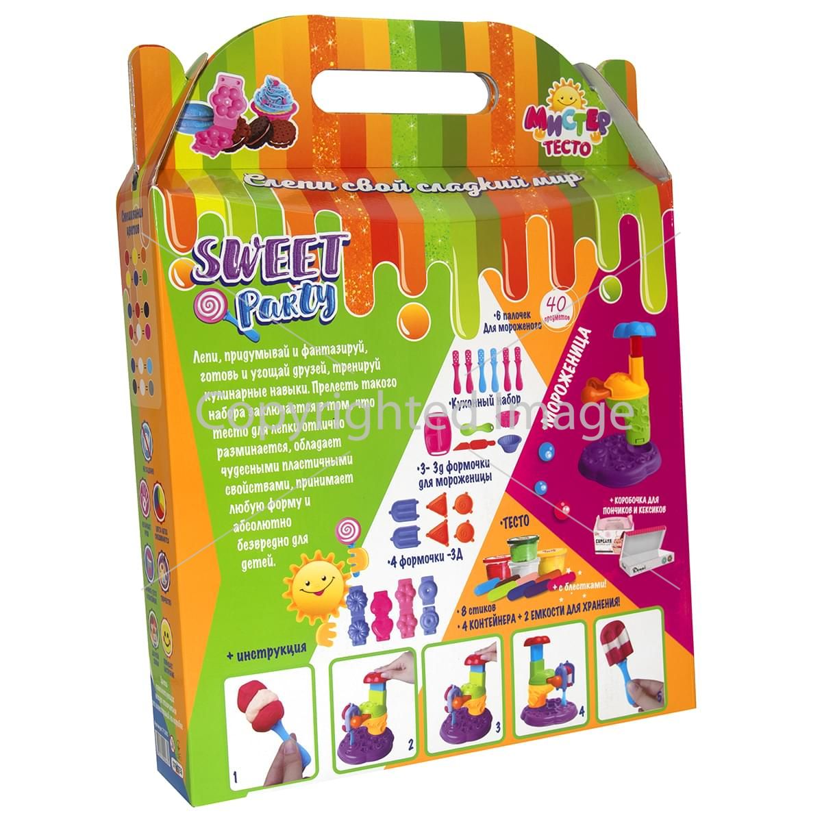 Солодкі пончики, морозиво, вафлі і печиво - хто з малюків не любить солодощі? Великий набір «Містер Тісто Sweet party» подарує дитині можливість відчути себе справжнім кондитером, який створює чарівні десерти і солодкі шедеври на своїй кухні! Це кондитерська в мініатюрі - в наборі є формочки для виготовлення морозива, кухонний набір, коробочки для готової продукції і незвичайні формочки 3D. А матеріалом, з якого дитина приготує свій солодкий шедевр, стане м'яке і пластичне тісто. Воно відмінно ліпиться, не липне до ручок і не забруднює їх. Тісто з блискітками приймає будь-яку форму, дозволить малюкові проявити найсміливіші фантазії! Це справжнє солодке королівство! Гра з кулінарним набором розвиває навички приготування їжі, покращує моторику і розвиває уяву.