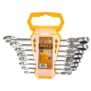 Набір ключів гайкових комбінованих храпових гнучких 8–19 мм 8 шт. INGCO INDUSTRIAL призначений для проведення ремонтних, складальних та демонтажних робіт з використанням шестигранного кріплення, включає 8 ключів з двома головками - ріжковою та рухомою кільцевою з тріскачковим механізмом. Матеріал інструментів - хромованадієва сталь, тріскачка виконана із міцного хроммолібденового сплаву.