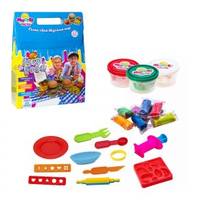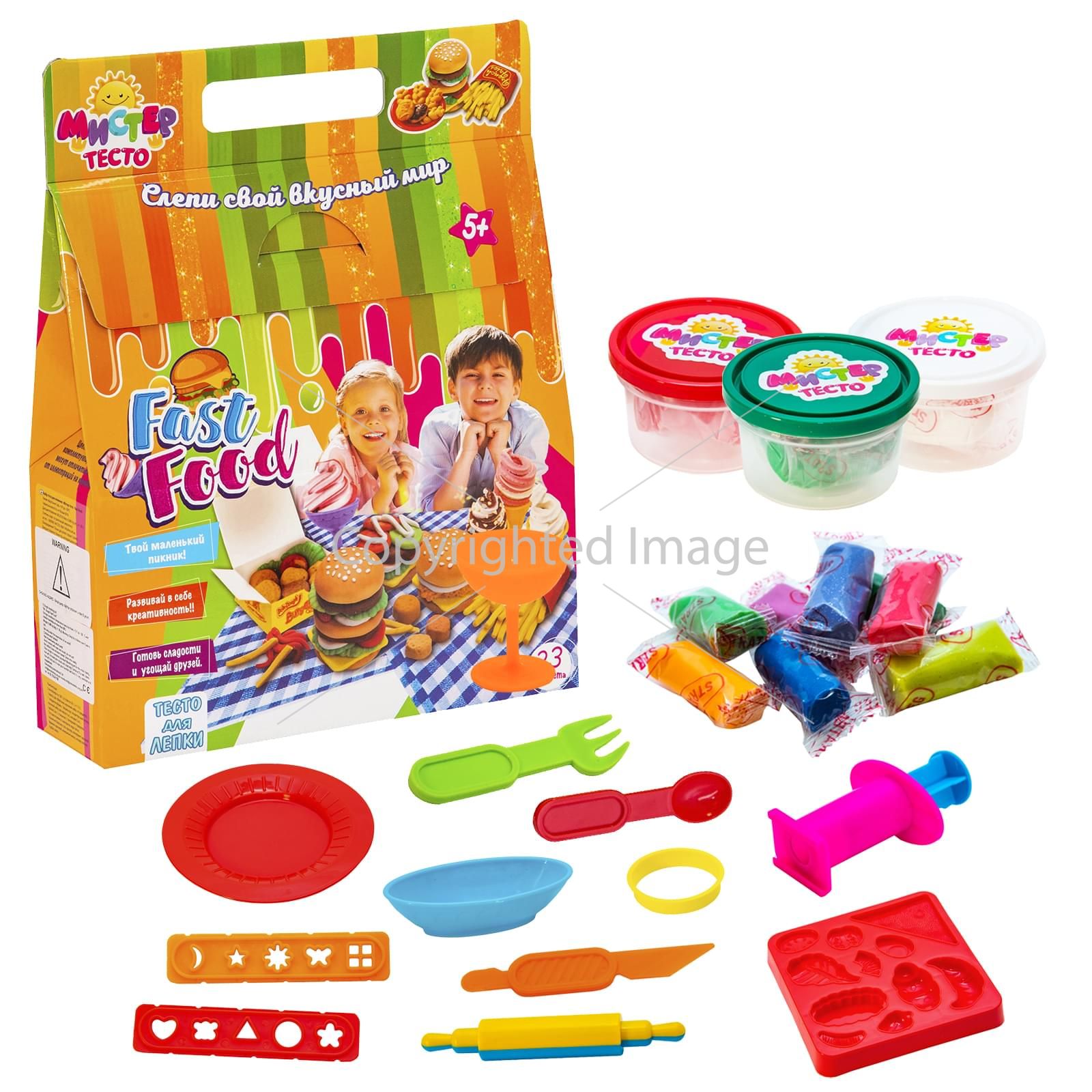 Ваш малюк любить пригощати друзів і готувати їжу? Допоможіть створити йому власне кафе швидкого харчування за допомогою набору «Містер тісто - Fast food». Велику кількість різних видів смачної їжі допоможуть відтворити формочки, кухонний набір, кондитерський шприц і тарілочки для сервірування. Можна сфантазувати будь-який вид смачного частування і виліпити його зі спеціального тіста. Тісто дуже пластичне, різні кольори легко змішуються, воно не забруднює руки і може приймати будь-яку форму.