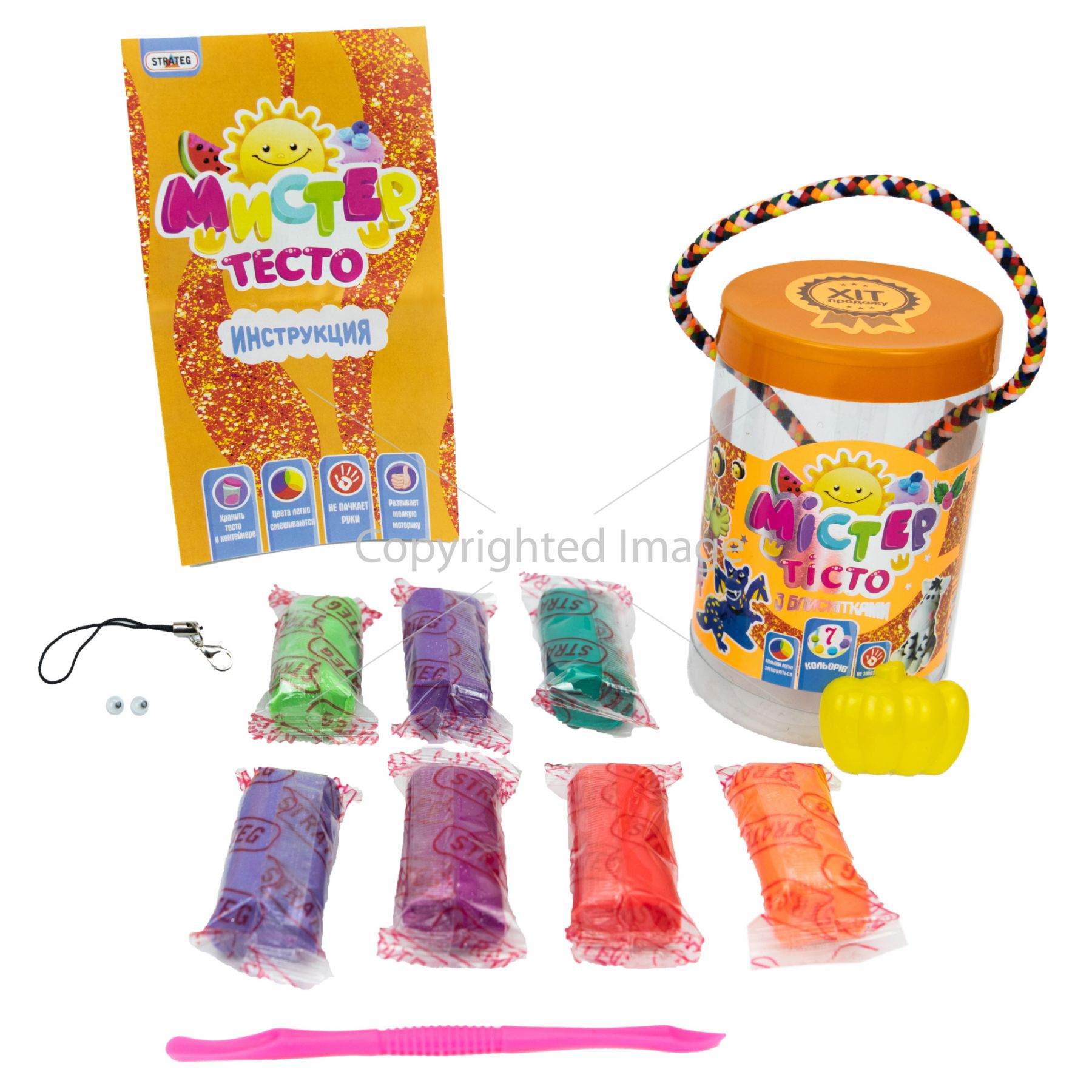 Комплектація:Тісто для ліплення - 7 шт, формочка - 1 шт, інструкція, оченята, стек, брелок.
