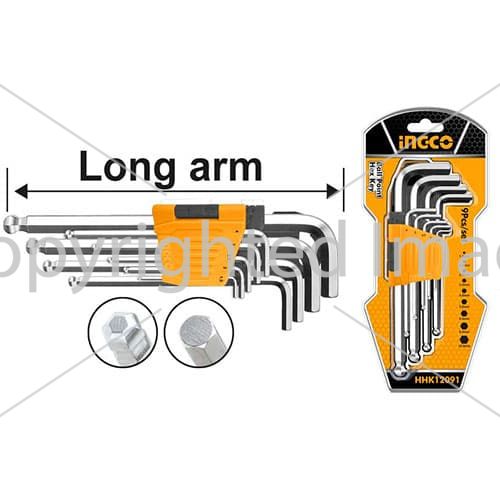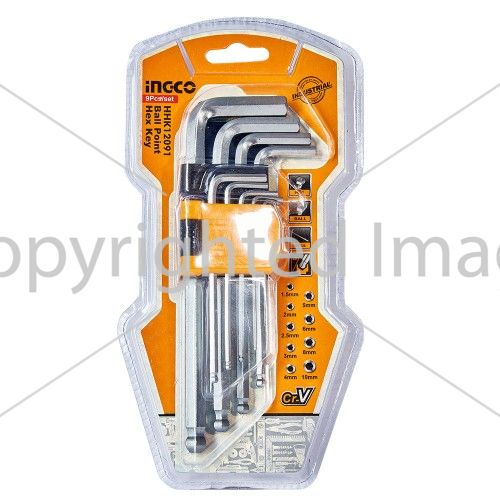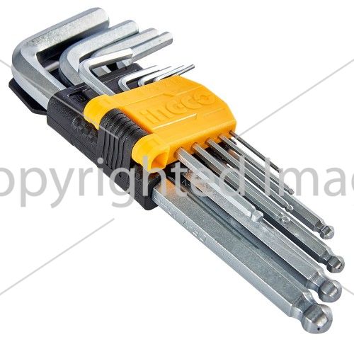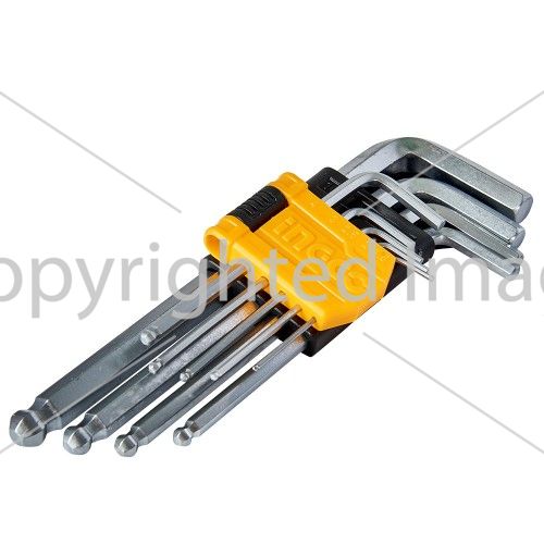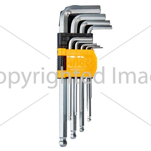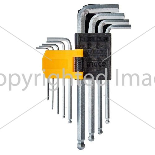 Набір ключів шестигранних з кулею 9 шт 1.5-10 мм INGCO містить 9 ключів різного розміру, які служать для монтажу і демонтажу кріплення з внутрішнім шестигранним шліцом.