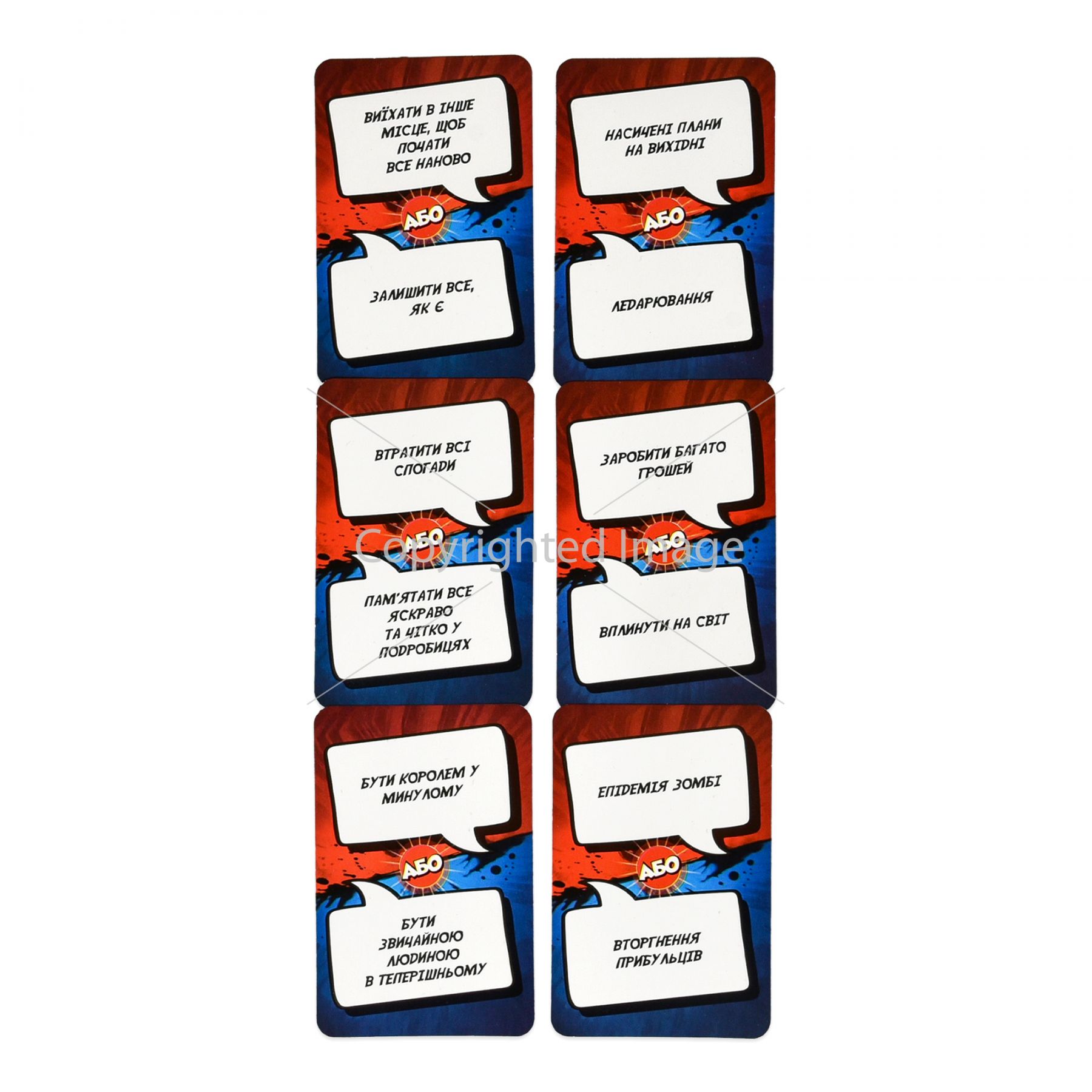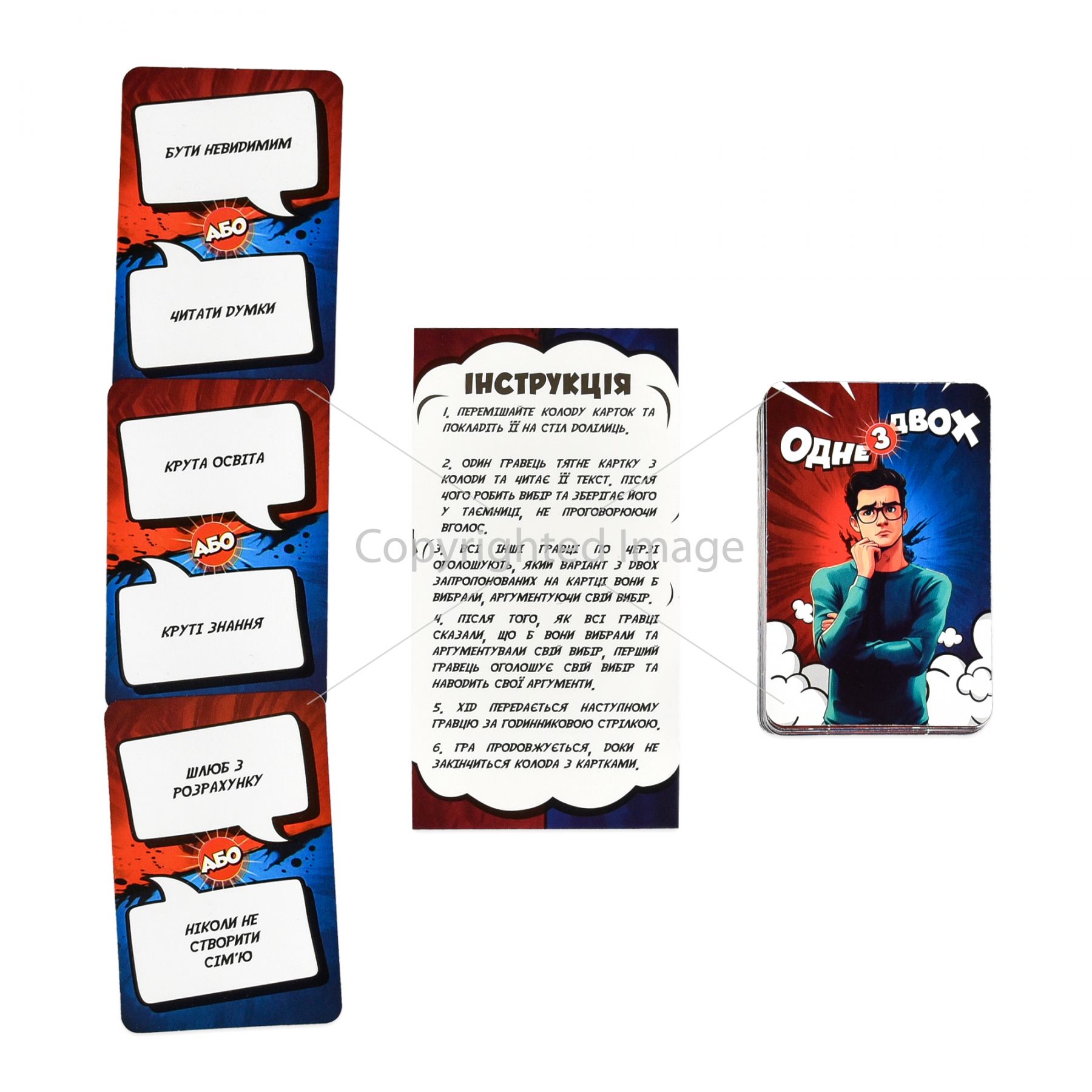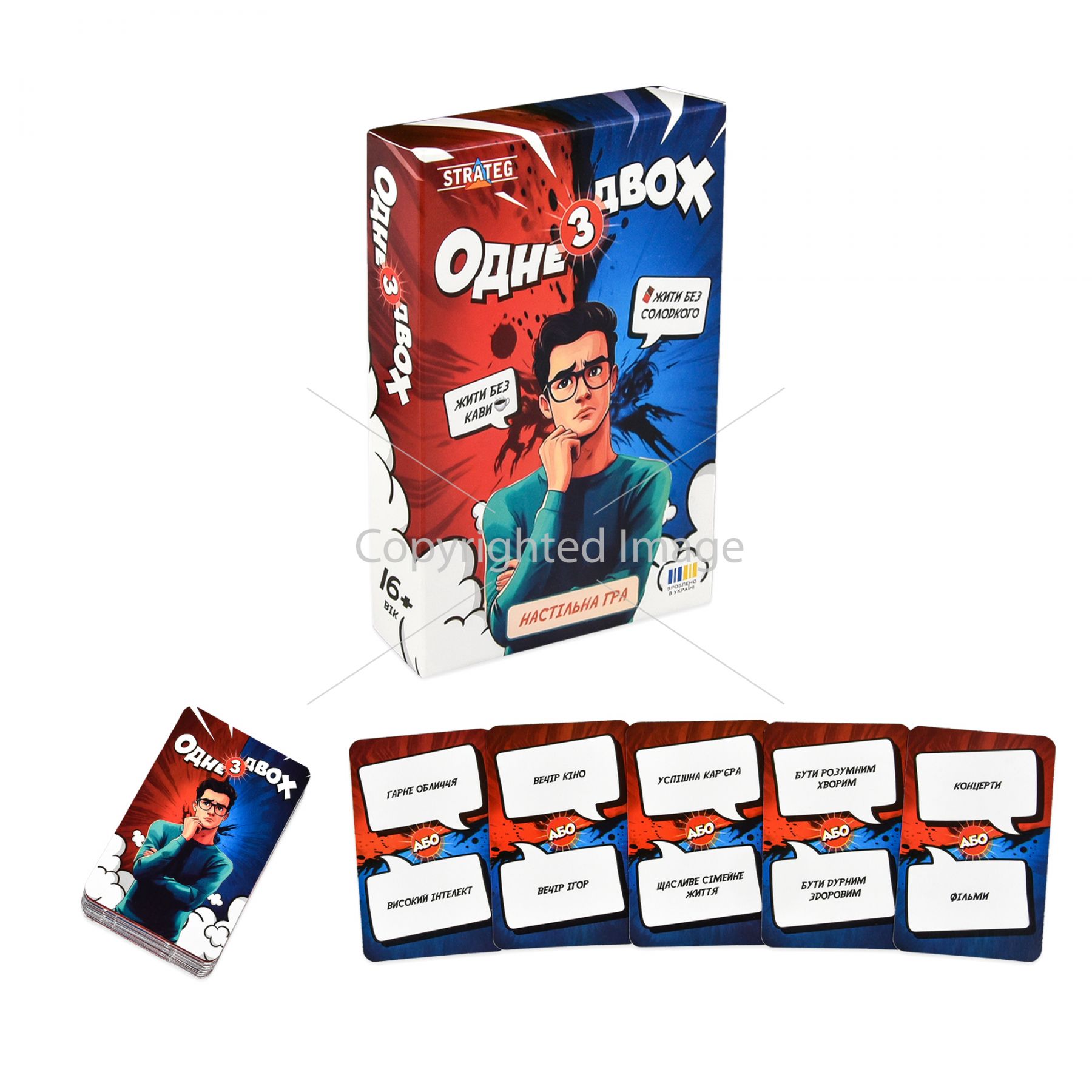 «Одне з двох» — настільна гра для компанії, щоб весело провести час і краще пізнати одне одного. На картках — два варіанти, обрати можна лише один.