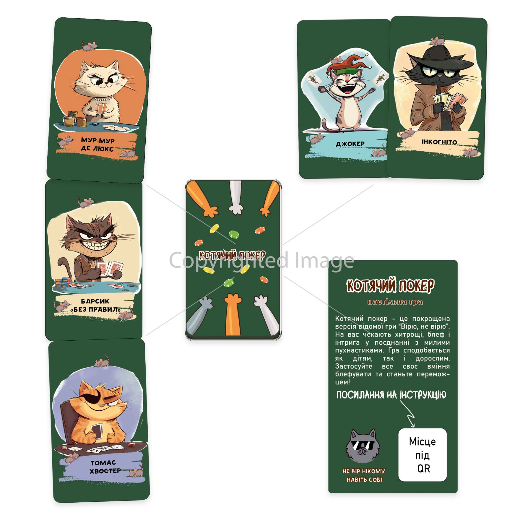 «Котячий покер» — це драйвова гра для вечірок, сімейних посиденьок і дружніх зустрічей. Веселі емоції й море сміху гарантовані!