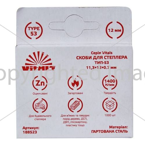 Скоби для степлера тип-53 12 × 0,7 мм 1000 шт. Vitals використовуються з будівельним степлером та призначені для кріплення різних матеріалів до поверхонь з м'яких та твердих порід дерева, ДВП, ДСП, пластику, гіпсокартону та ін.