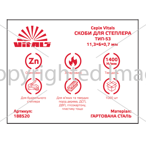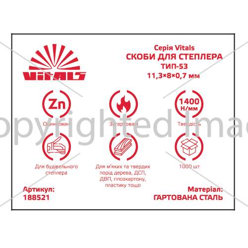 Скоби для степлера тип-53 6 × 0,7 мм 1000 шт. Vitals використовуються з будівельним степлером та призначені для кріплення різних матеріалів до поверхонь з м'яких та твердих порід дерева, ДВП, ДСП, пластику, гіпсокартону та ін.