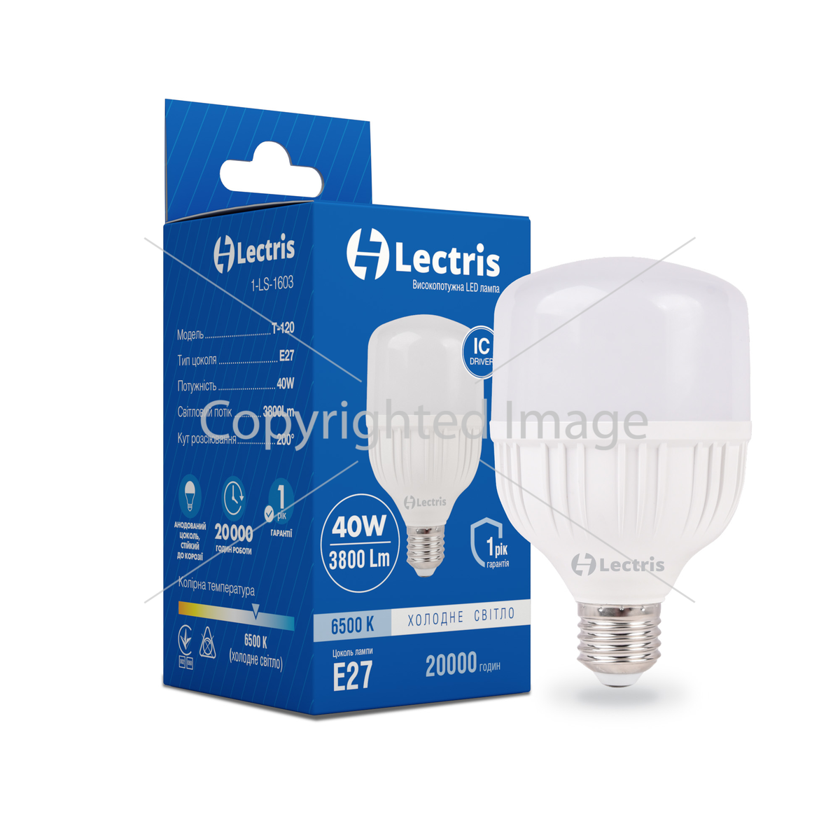 Світлодіодна високопотужна лампа Lectris 1-LC-1603 на 40 Вт видає 3800 Лм. Споживаючи в рази менше електрики, ніж лампи розжарювання або люмінесцентні лампи, вона дає таку ж кількість світла і прослужить в кілька разів довше. Лампа має холодне світло, що робить її придатною для промислових приміщень і вуличних світильників. У лампі використовується стандартний цоколь Е27.